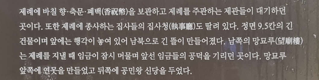 정면 9,5칸의 긴 건물로 앞에는 행각이 놓여있어 남북으로 긴 뜰이 만들어 졋다, 남쪽의 망묘루는 졔례를 지낼때 임금이 잠시 머물며 앞선 임금들의 공덕을 기리던 곳이다, 망묘루 앞쪽에 연못을 만들었고 뒤 쪽에 공민왕 신당을 두었다,