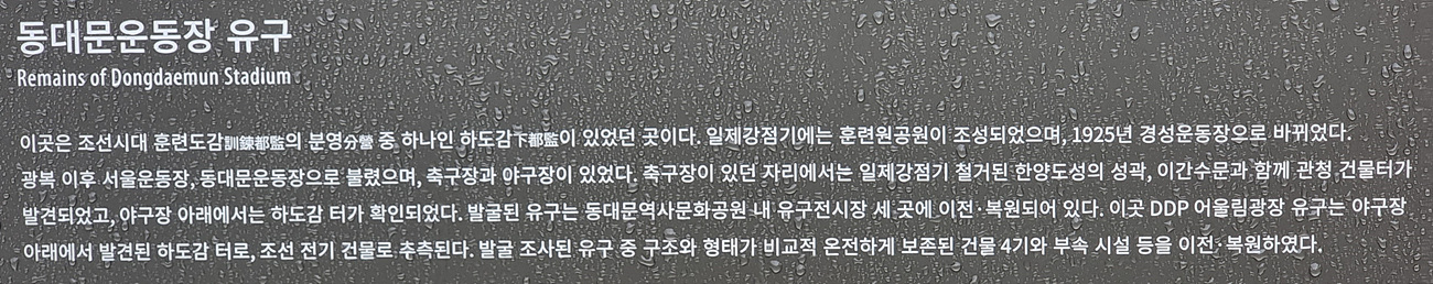 이곳은 조선시대 훈련도감의 분영중 하나인 下 도감이 있었던 곳이다, 일제 강점기에는 훈련원공원이 조성되었어며 1925년에 경성운동장으로 광복이후 에는 서울운동장, 동대문운동장으로 축구장과 야구장이 있었다, 축구장이 있었던 자리에서는 일제강점기에 철거된 한양도성의 성곽, 이간수문과 함께 관청건물터가 발견되었고 야구장 아래 에서는 下도감터가 확인되었다