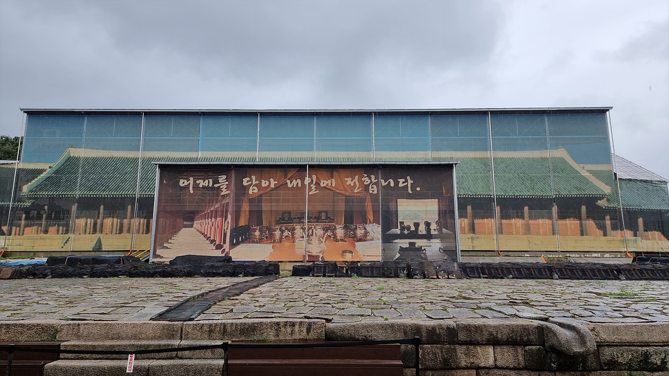 종묘 정전은 지금 보수정비 공사중이다, 2024년 9월 21일이 준공으로 기와교체와 이완된 부재 해체후 재설치 등의 공사를 하는 중이다,
