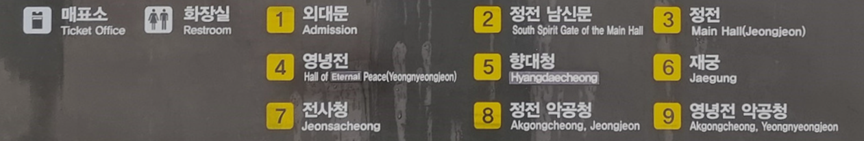 종묘의 정문 1번은 외대문, 2번은 정전 남신문, 3번은 정전 등으료 표기되여 있다,