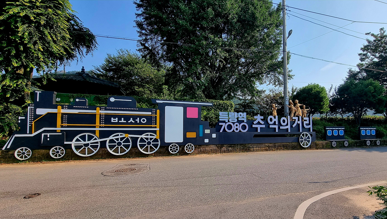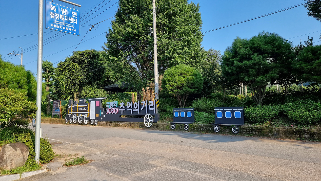 화단에 있는 보성마천석교비를 살펴보고나서 전면 도로를 보니 득량역 7080 추억의거리 라는 기차모형의 안내판이 있다,