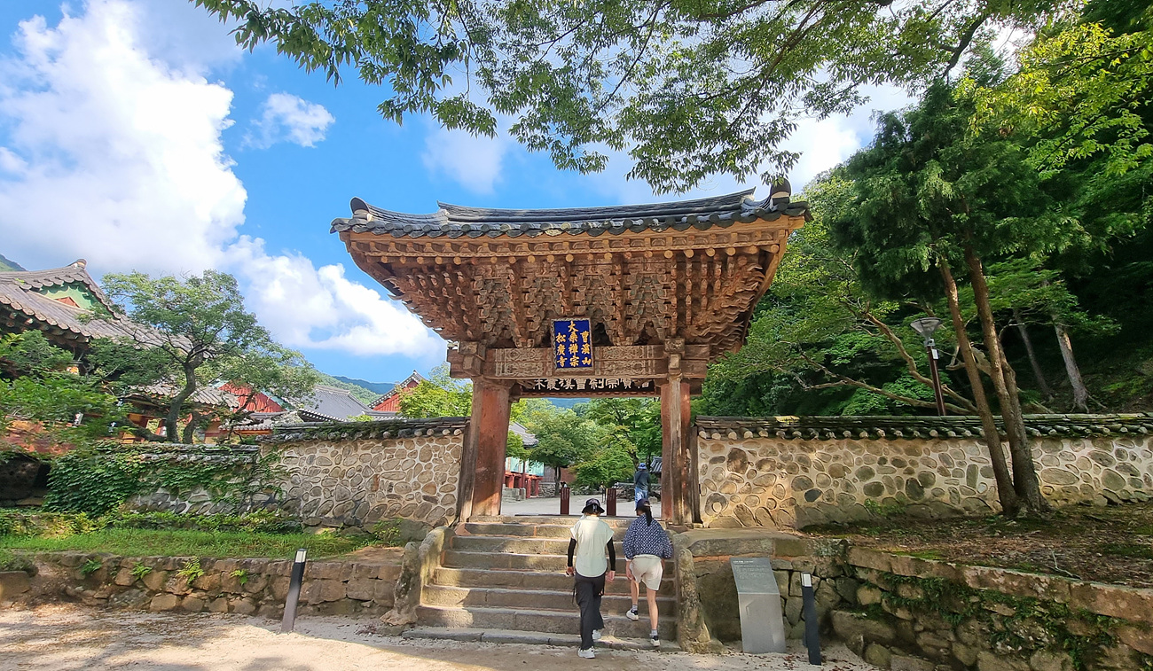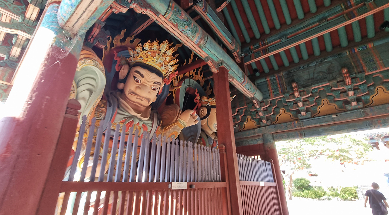 우화각을 지나 들어가면 천왕문이다, 천왕문 좌우에는 동방의 지국천왕, 남방의 증장천왕, 서방의 광목천왕, 북방의 다문천왕 등 사천왕이 있다,