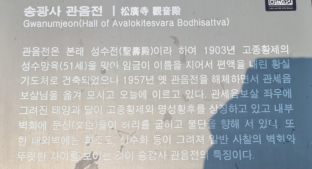 관세음보살 좌우에 그려진 태양과 달이 고종황제와 명성황후를 상징하고 있고 내부 벽화에 文臣(문신)들이 허리를 굽히고 불단을 향해 서 있다, 또한 내외벽에는 화조도 산수화 등이 그려져 일반 사찰의 벽화와 뚜렸한 차이를 보이는 것이 송광사 관음전의 특징이다, - 안내문 옮김 _