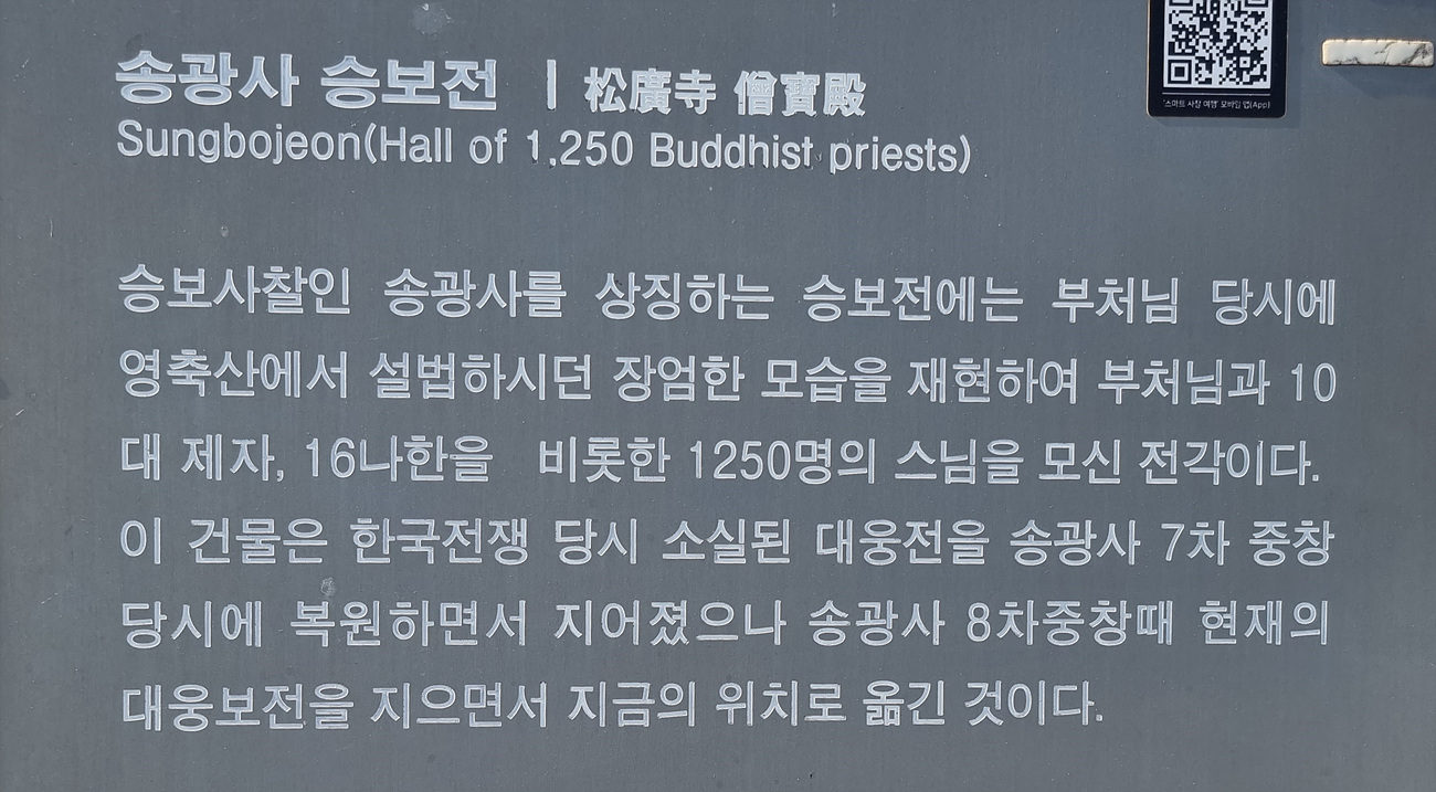 대웅전을 바라보는 장소 왼쪽에는 승보전이 있다, 승보사찰인 송광사를 상징하는 승보전에는 부처님 당시에 영축산에서 설법 하시던 장엄한 모습을 재현하여 부처님과 10대제자 16나한을 비롯항 1250명의 스님을 모신 전각이다,
