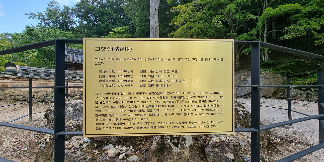 이처름 많은 명사들이 기리는 속에 고향수는 보조스님께서 송광사에 환생하여 오시면 다시 푸른 잎을 피우게 되기를 꿈 꾸면서 불가사의하게도 800여년 동안을 이 모습으로 기다리고 있다,