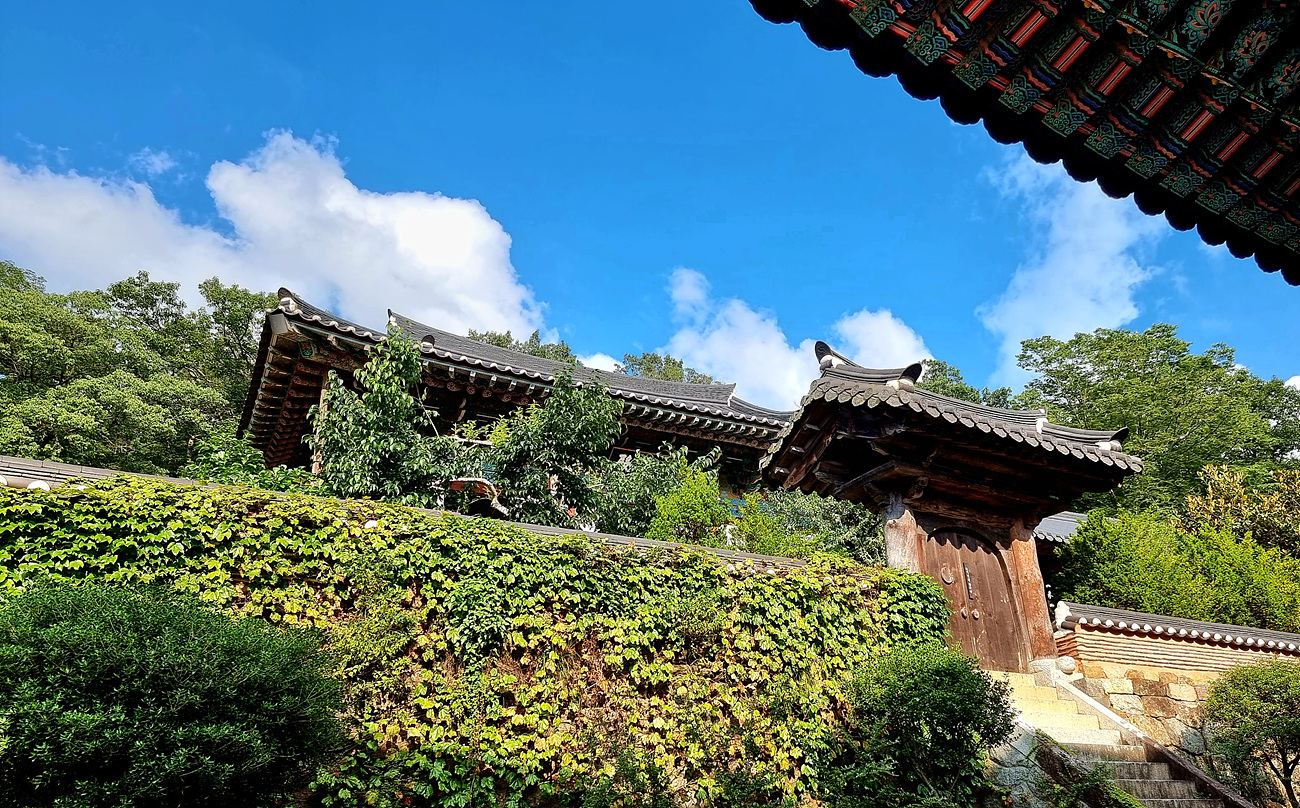 고풍스럽게 보이는 수선사 높은 언덕에 피여난 넝쿨 담장이 아름다움을 더해준다,
