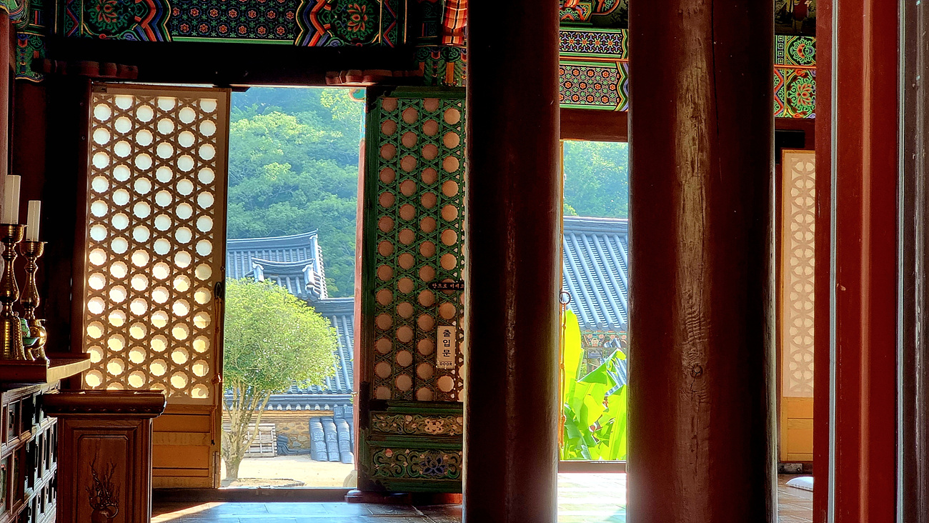 대웅전뒤 열려있는 창문으로 송광사 전면을 보면 이 또한 그림같은 예술 작품이다,
