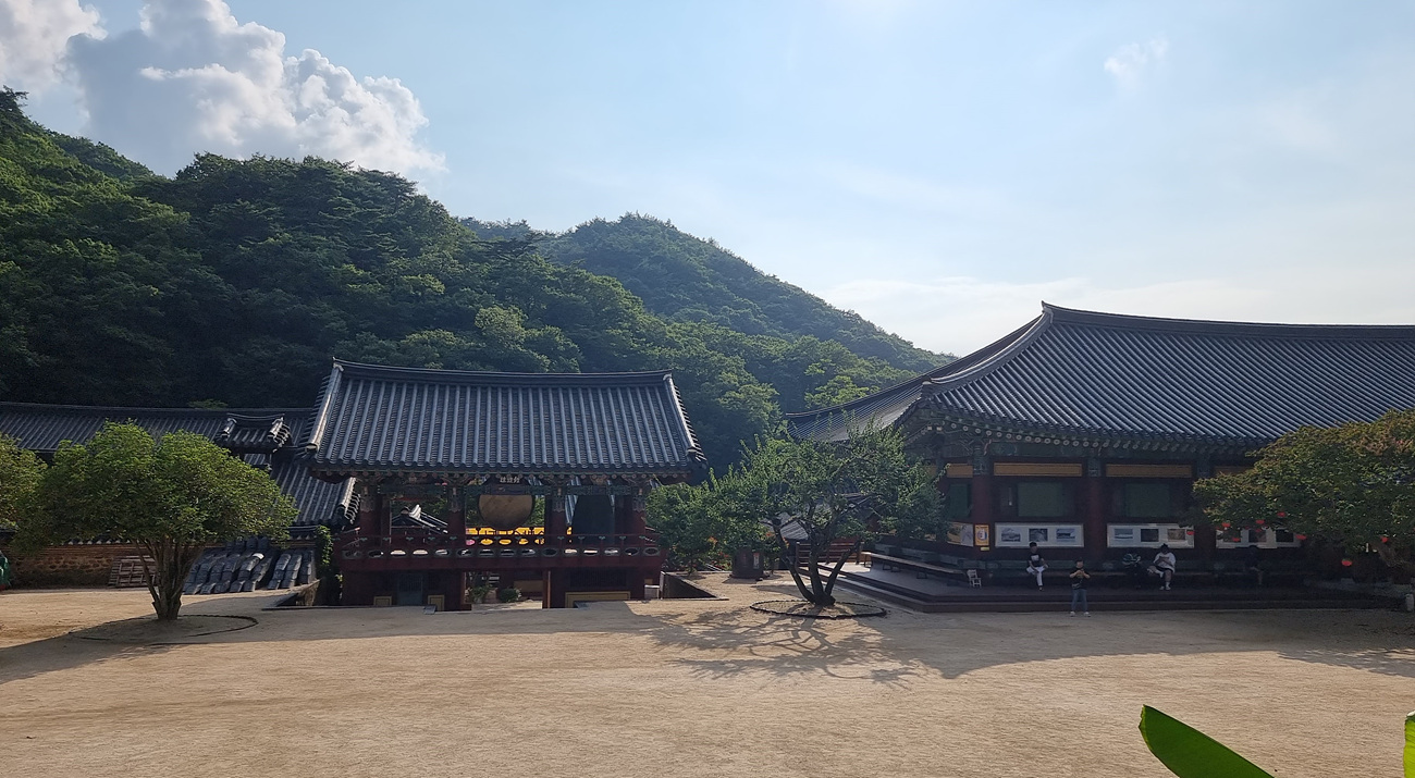 羽化閣(우화각)과 천왕문, 鐘鼓樓(종고루) 건물은 대웅전을 향하여 일직선 상에 나란히 위치했다,