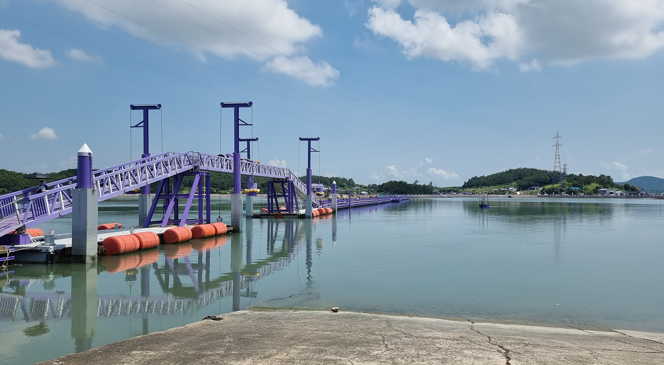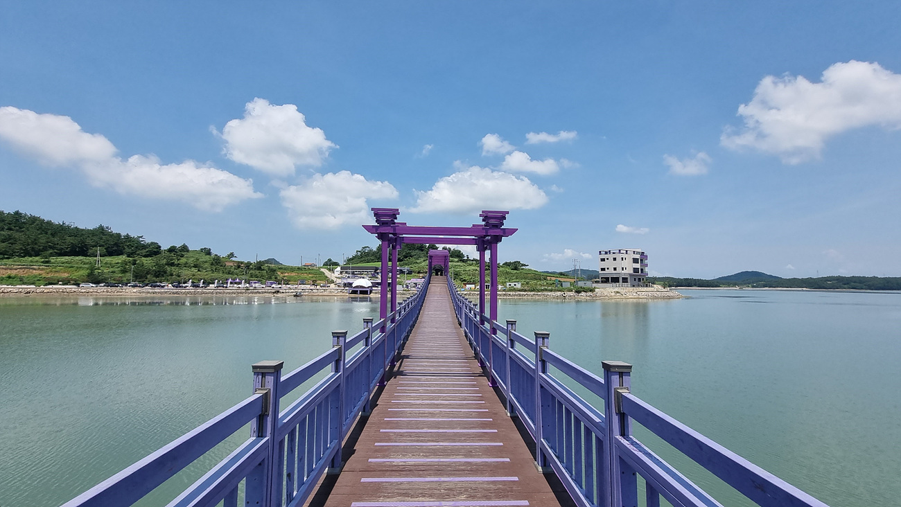 반월도로 건너와 보라색 다리 전체를 보면 이런 모습이다, 선착장앞 다리를 높게 만든 것은 어선이 지나 다닐 수 있게 만든 뱃길인듯 하다,