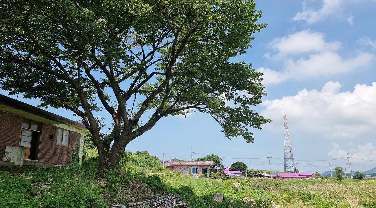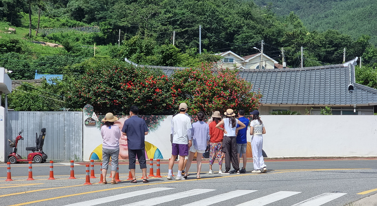 전남 화순군 동복면 한천리 삼복권역 커뮤니티센터에서 퍼플섬까지는 2시간 10분 정도는 달려가야 하는 150여km의 길이다, 광주와 목포를지나 신안군 천사대교까지 건너가서야 퍼플섬으로 가는데 같은 남도라고 해도 가는 길은 멀기만 했다, 퍼플섬으로 거의 다 간 지점 담벼락, 동백나무 파마↑머리를 한 소문난 벽화구경도 한다,