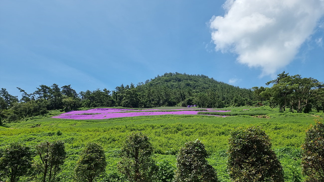 산 비탈에 보라빛 꽃단지 처름 꾸며놓은 것은 보라색 꽃단지가 아니라 보라빛 천으로 덮어 놓았다, 아무리 보라 색만 보이면 될 것이라고 해도 이건 아닌듯하다, 보라색 꽃들이 얼마나 많은데? 색 천으로 위장을 하다니,