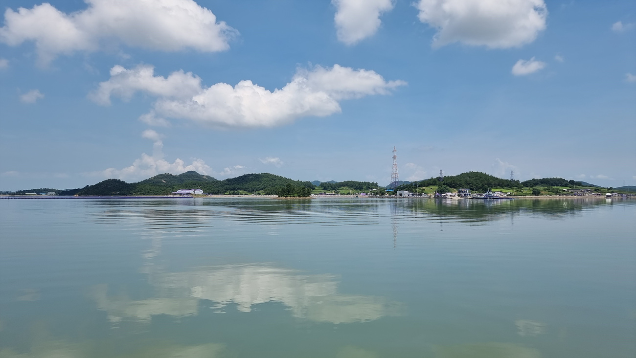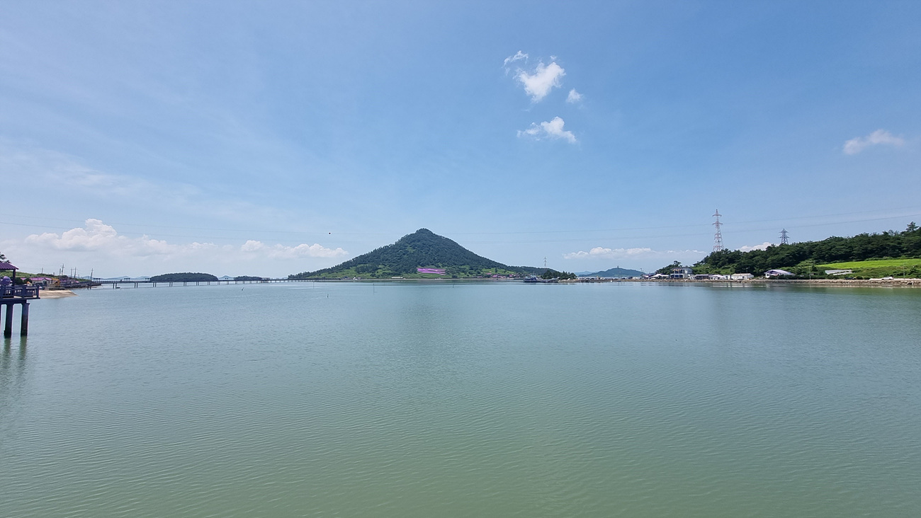 나가다가 위 쪽으로 올려다 보니 바다에 떠있는 안좌도 일대와 뭉게 구름이 잔잔한 바다에 투영되면서 그림처름 다가오고