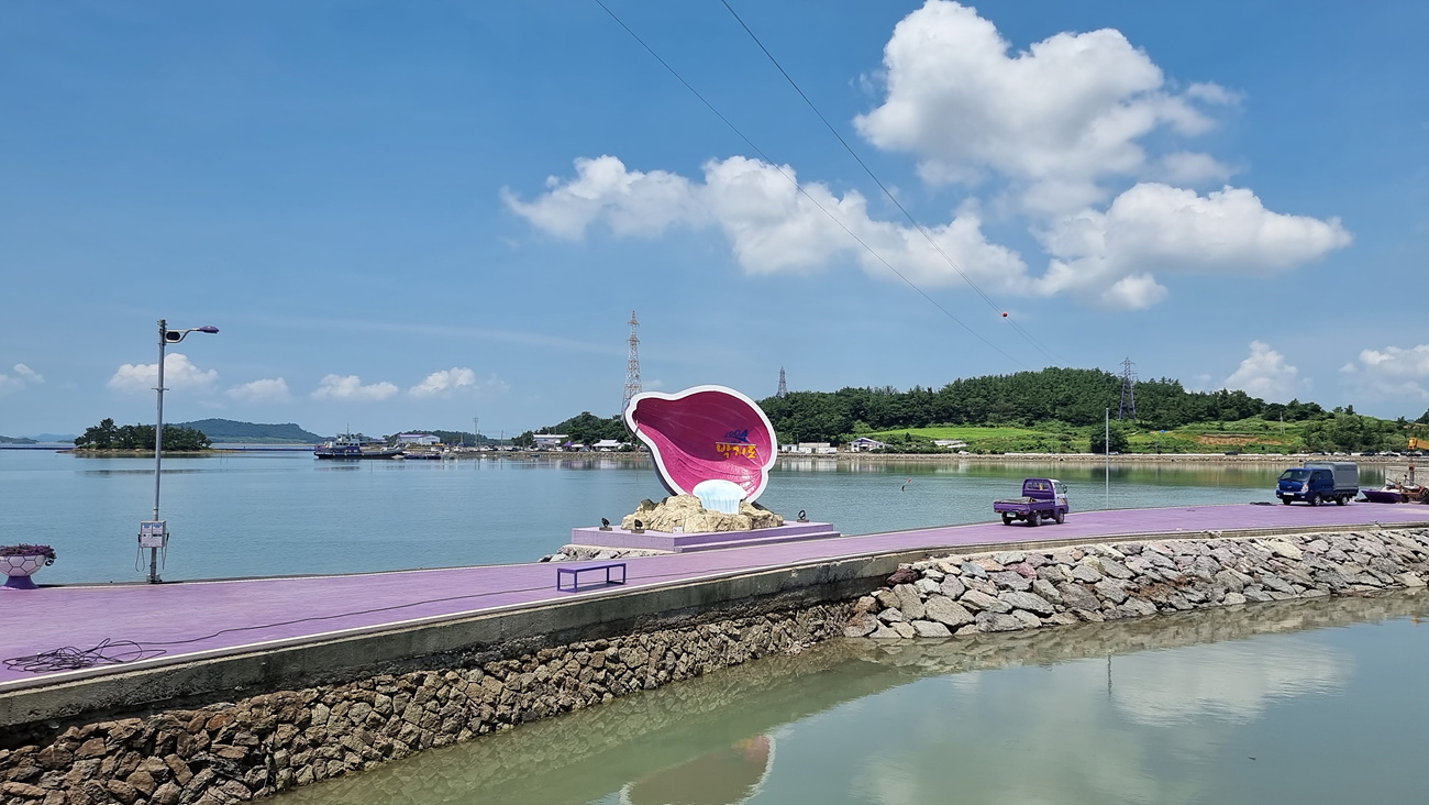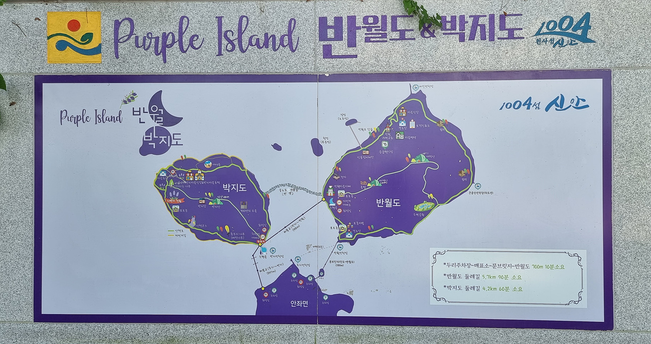프플섬으로 가기 위해 주차장이 있는 안좌도에 도착을 하면 마주 보이는 반월도와 박지도 해안가는 온통 보랏빛으로 물이 든 모습이다,