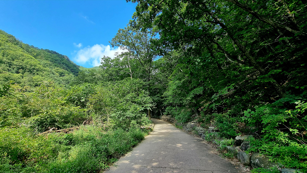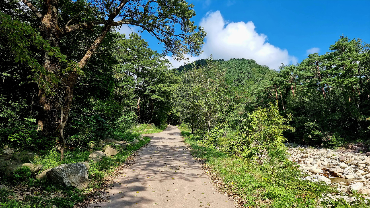 여기에도 개천을 따라 임도가 개설되어 있어 길은 편하다,
