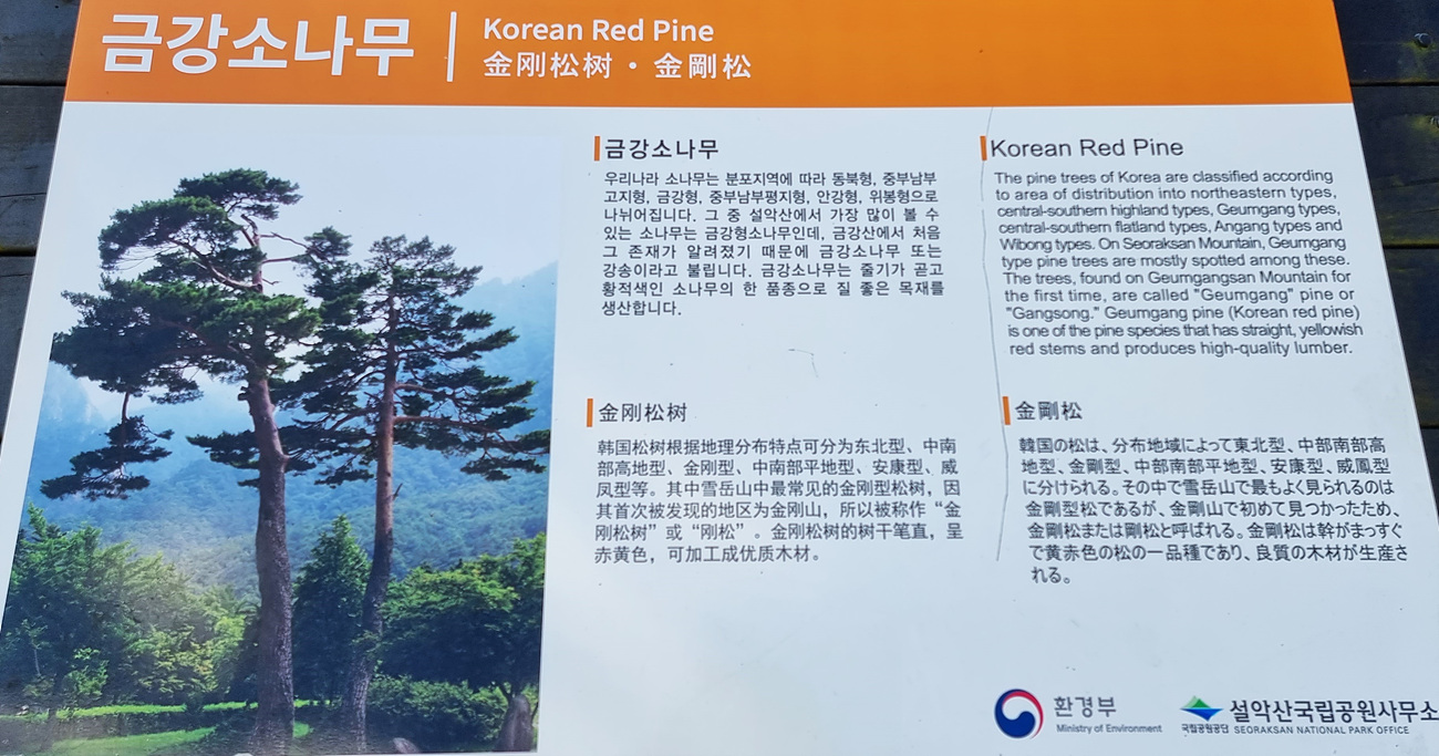 그 중 설악산에서 가장 많이 볼 수 있는 소나무는 금강형소나무로 금강산에서 처음 그 존재가 알려졌기 때문에 금강소나무 또는 강송이라고 불린다, 금강소나무는 줄기가 곧고 황적색인 소나무의 한 품종으로 질 좋은 목재를 생산한다,