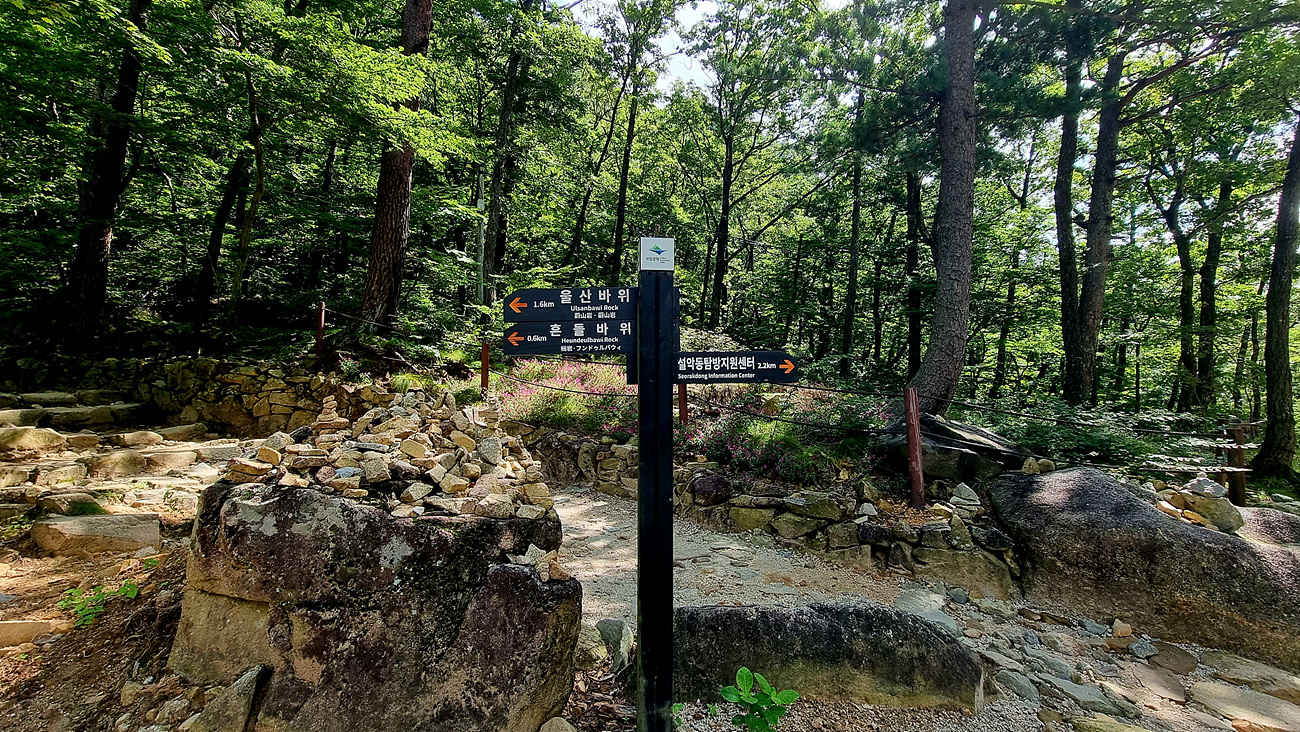 이곳에 세워진 이정표는 설악동탐방지원센터에서 여기는 1,4km이고 흔들바위 까지는 1,4km, 울산바위는 2,4km의 거리라 알려준다, 거리 표식만 보면 왠지 만만해 보이는데