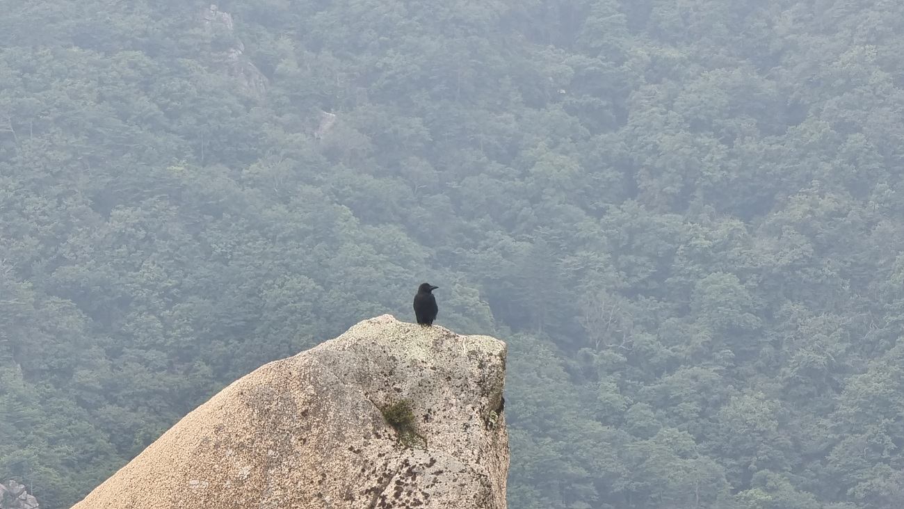 옆을 돌아보니 바위 위에 올려진 돌 위에 까마귀가 주인 행세를 하고있다,