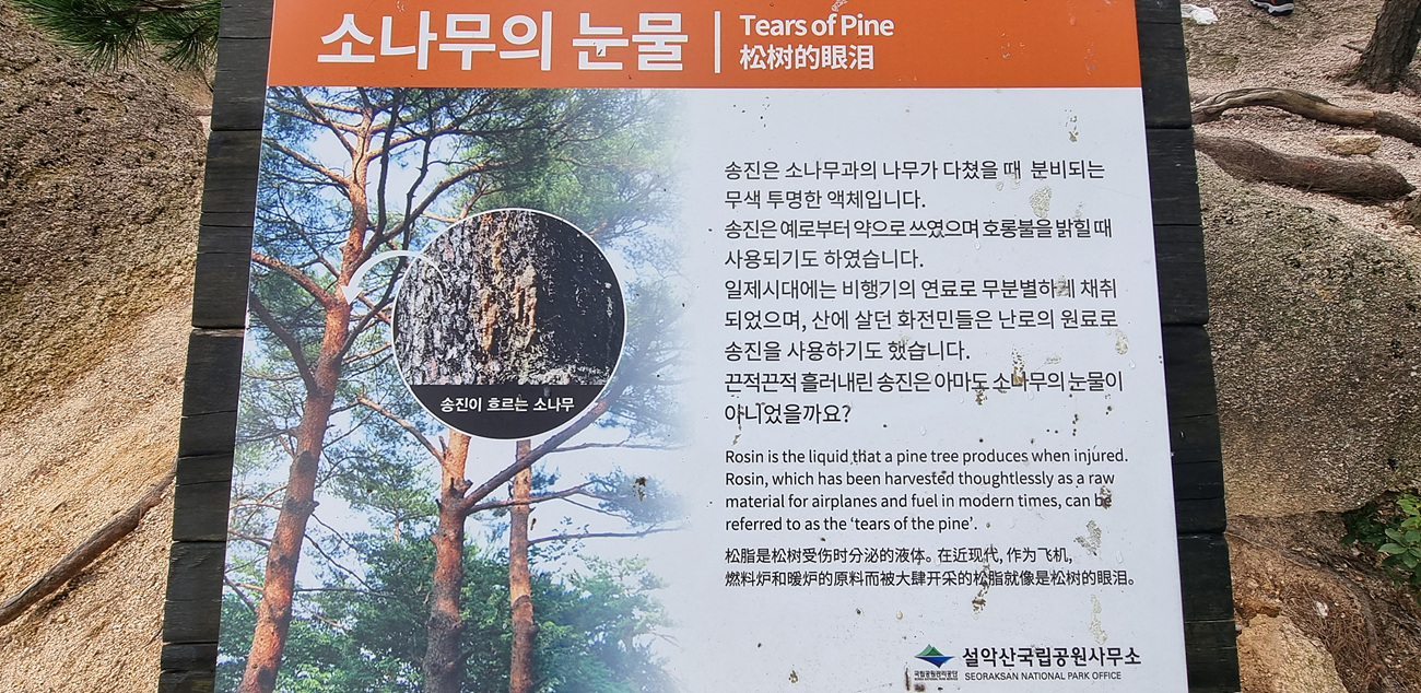 이곳에 있는 안내판에는 소나무의 눈물이라는 글이 적혀있는데, 송진은 소나무과의 나무가 다쳣을때 분비되는 투명한 액체로, 송진은 예로부터 약으로도 쓰였고 호롱불을 밝힐때 사용되기도 했어며
