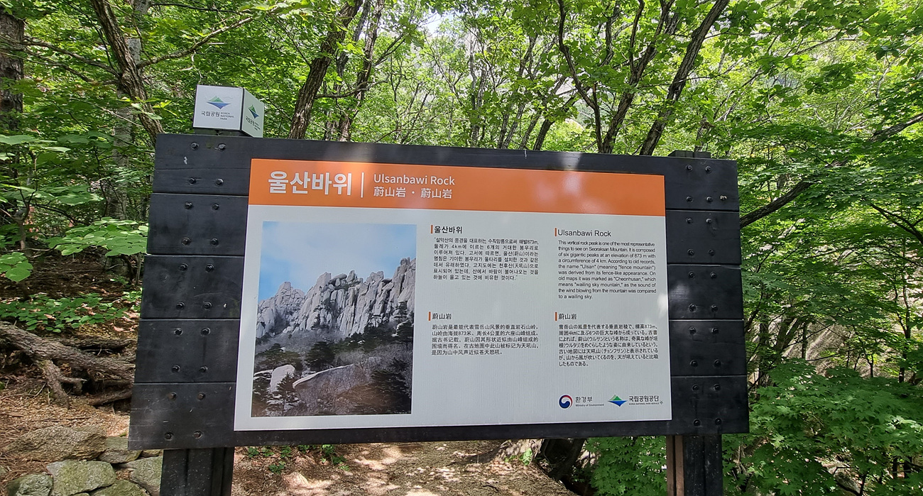蔚山岩(울산암) 울산바위는 설악산의 풍경을 대표하는 수직 암릉으로 해발 873m, 둘레가 5km에 이르는 6개의 거대한 봉우리로 이루어진 바위다,