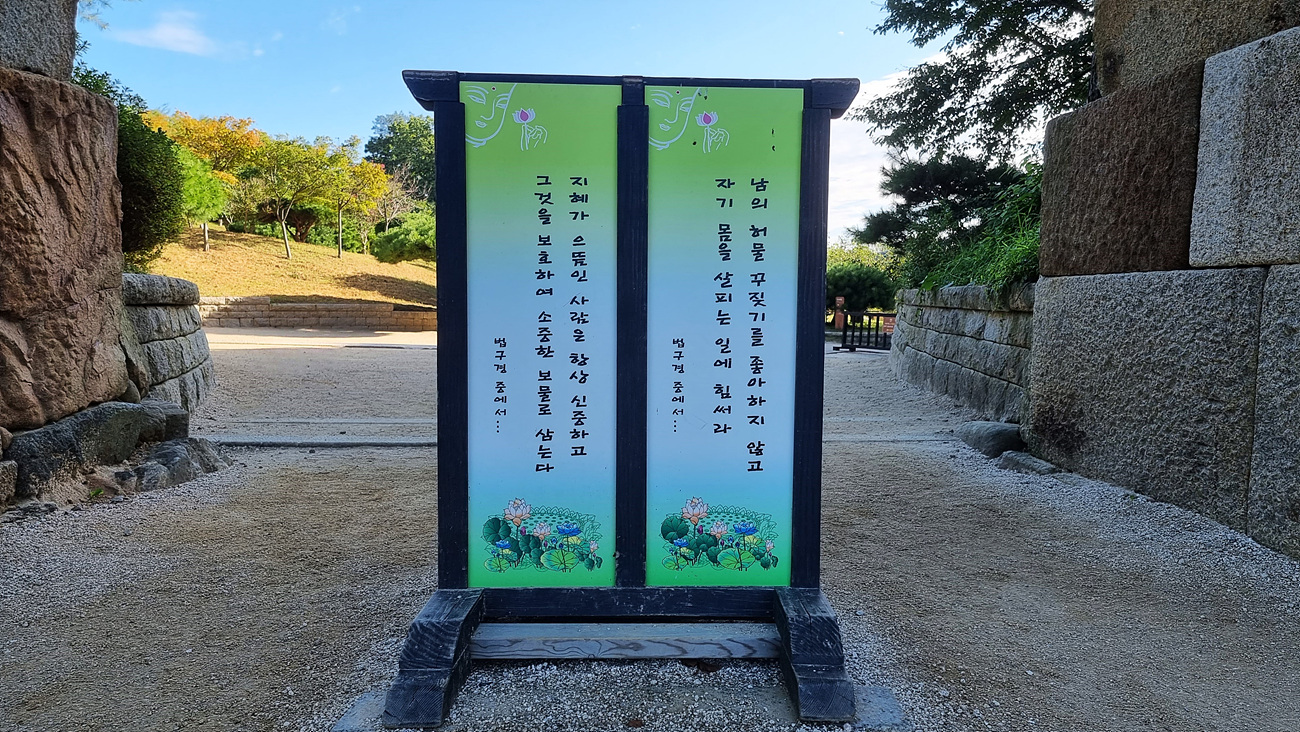 홍예문으로 들어 가는 길에는 법구경 구절이 적혀있다,