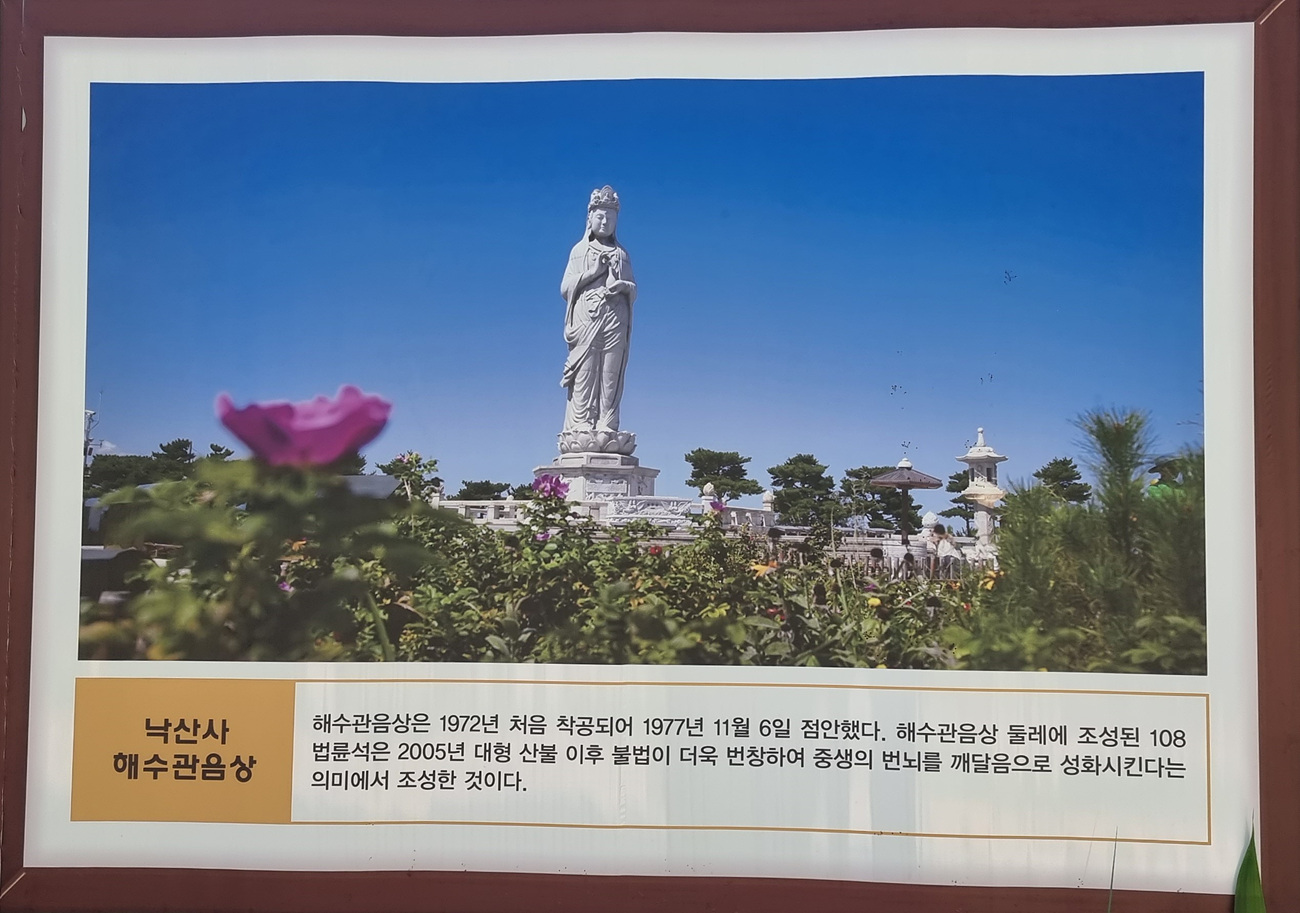 공사장 울타리에 전시되여 있는 낙산사 해수관음상 1972년에 착공되어 1977년에 11월에 점안 했다고 알려준다, 해수관음상 둘레에 조성한 108 법륜석은 2005년 대형 산불 이후 불법이 더욱 번창하여 중생의 번뇌를 깨달음으로 성화시킨다는 의미에서 조성한 것이다,