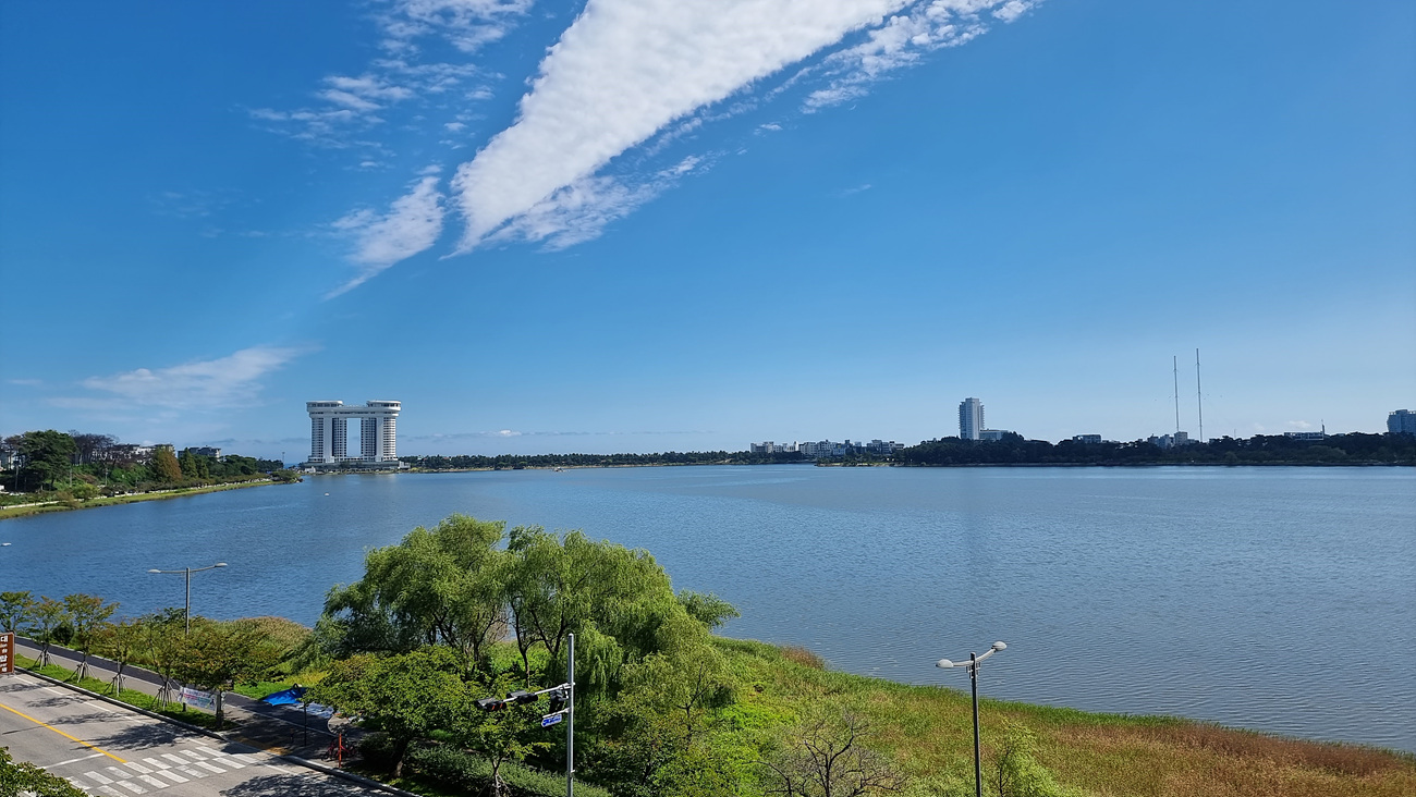 경포호 건너 경포대해수욕장 해안에 두동이 서로 연결되여 있는 스카이베이호텔경포 와