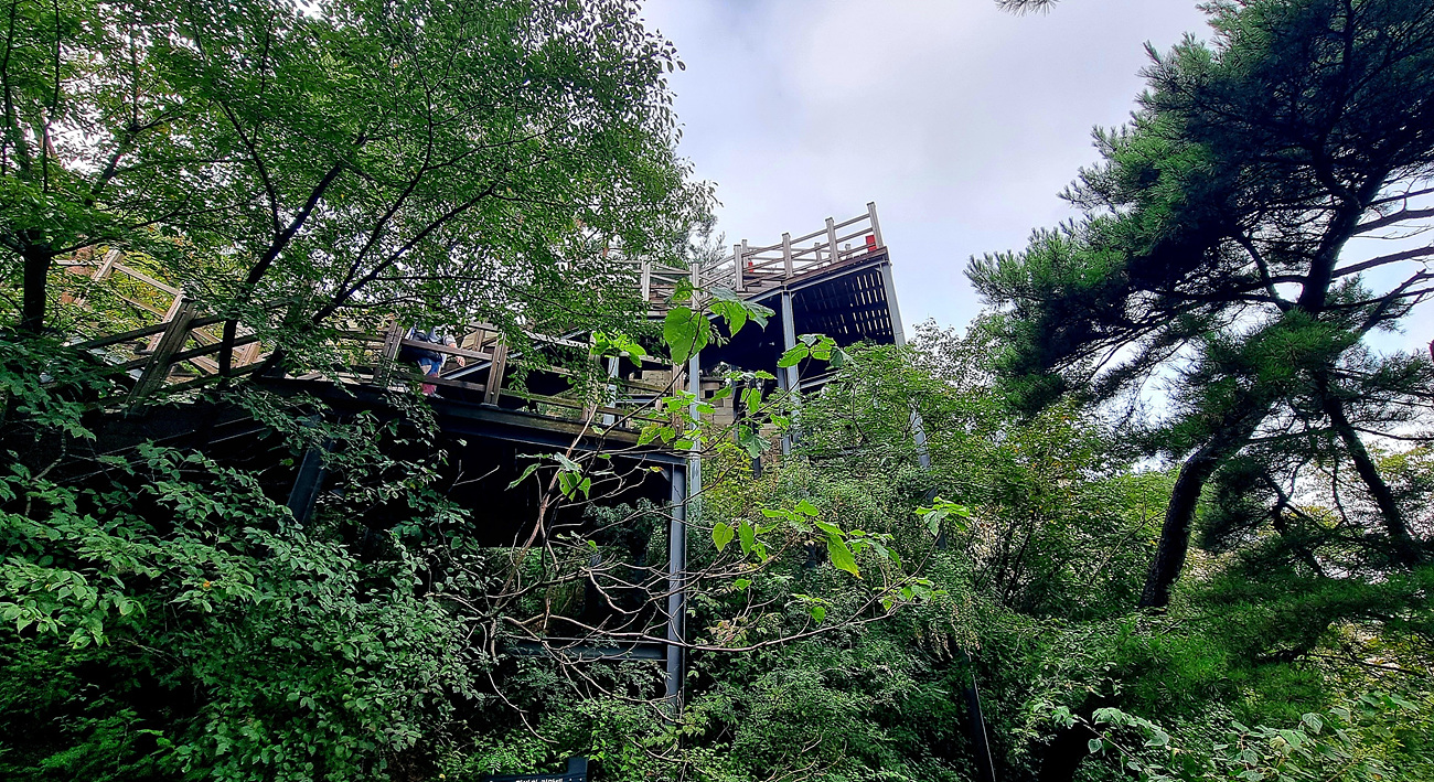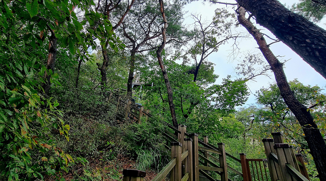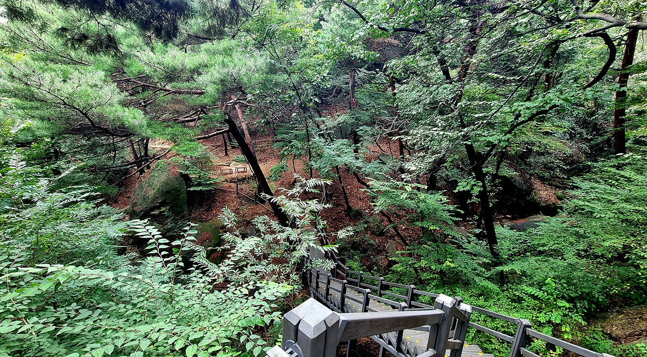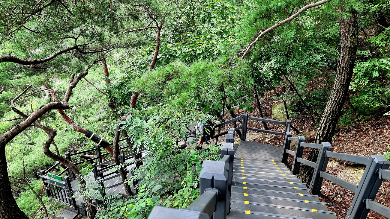 첫번째 계단으로 내려가면서 왼쪽으로 보면 조금 전에 쉬었던 촛대바위 쉼터가보인다, 숲에 가려저서 잘 보이지 않아 촛대 바위 형체를 못 보는게 이쉽다,