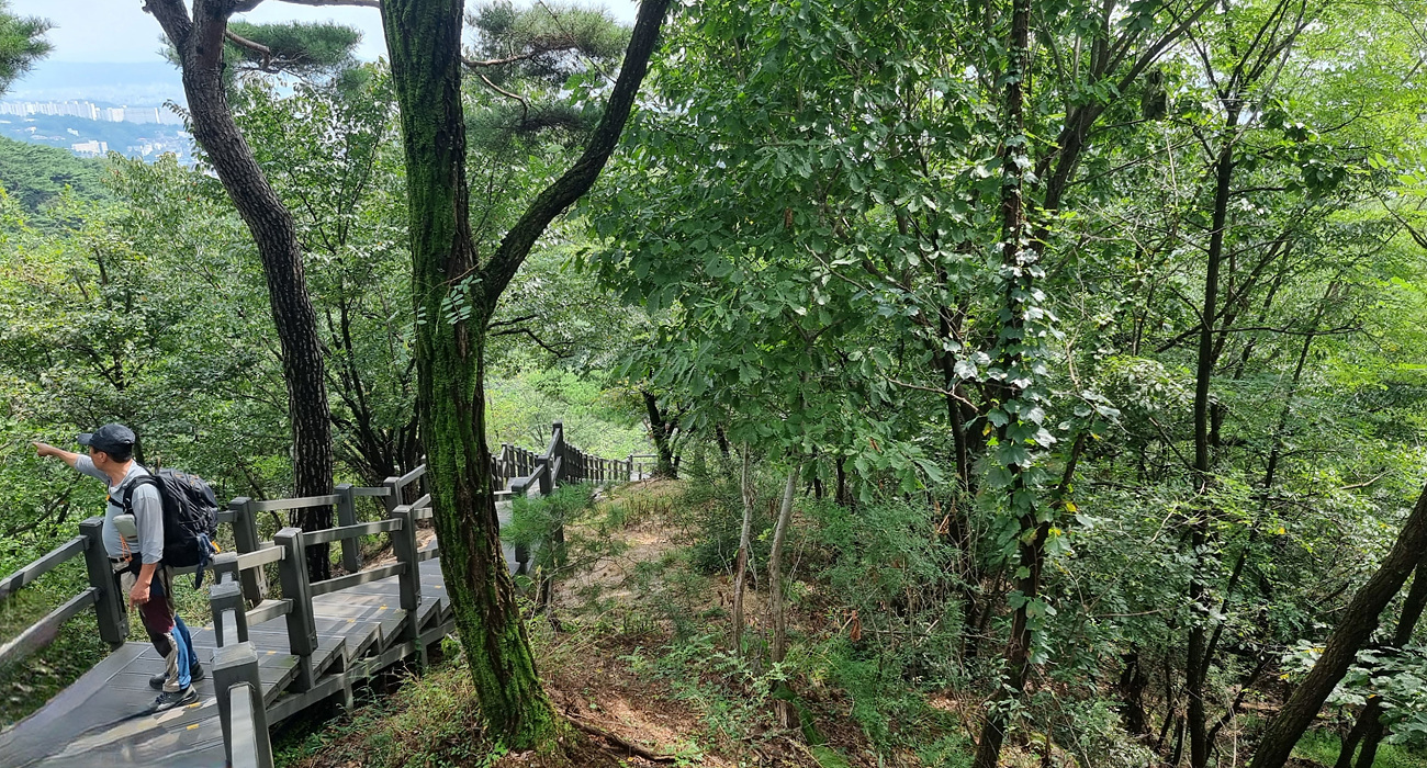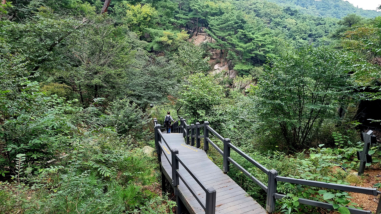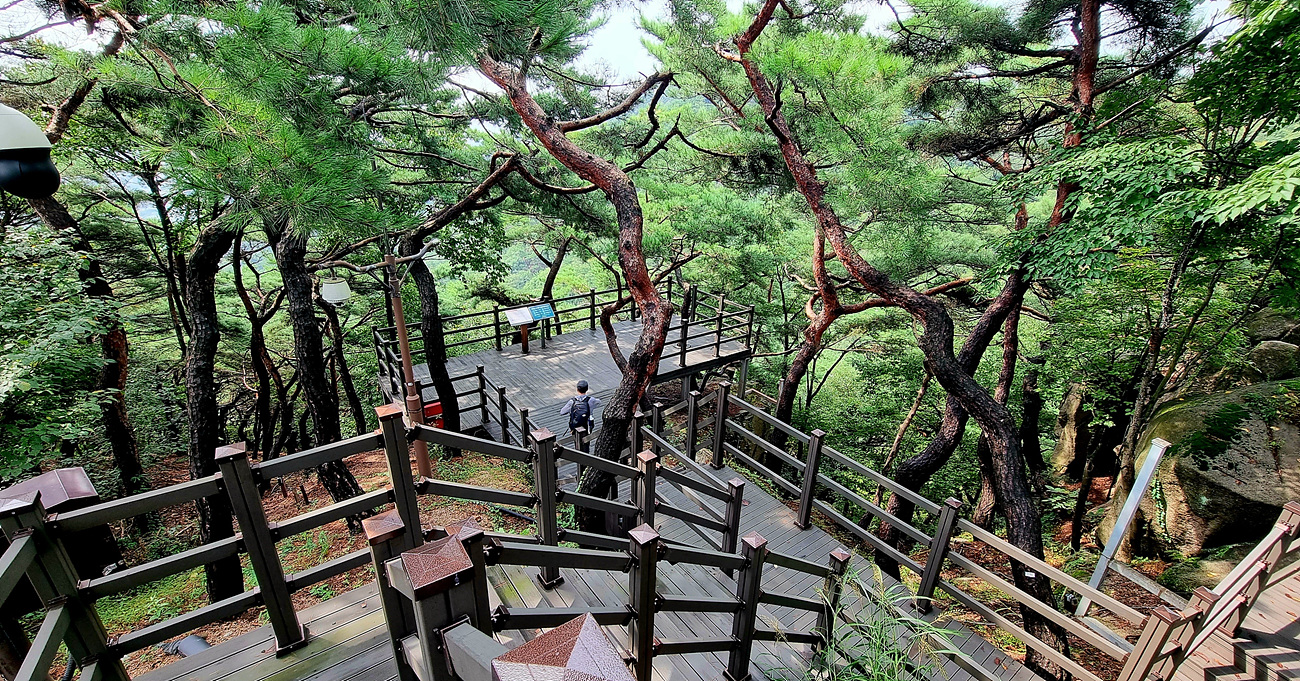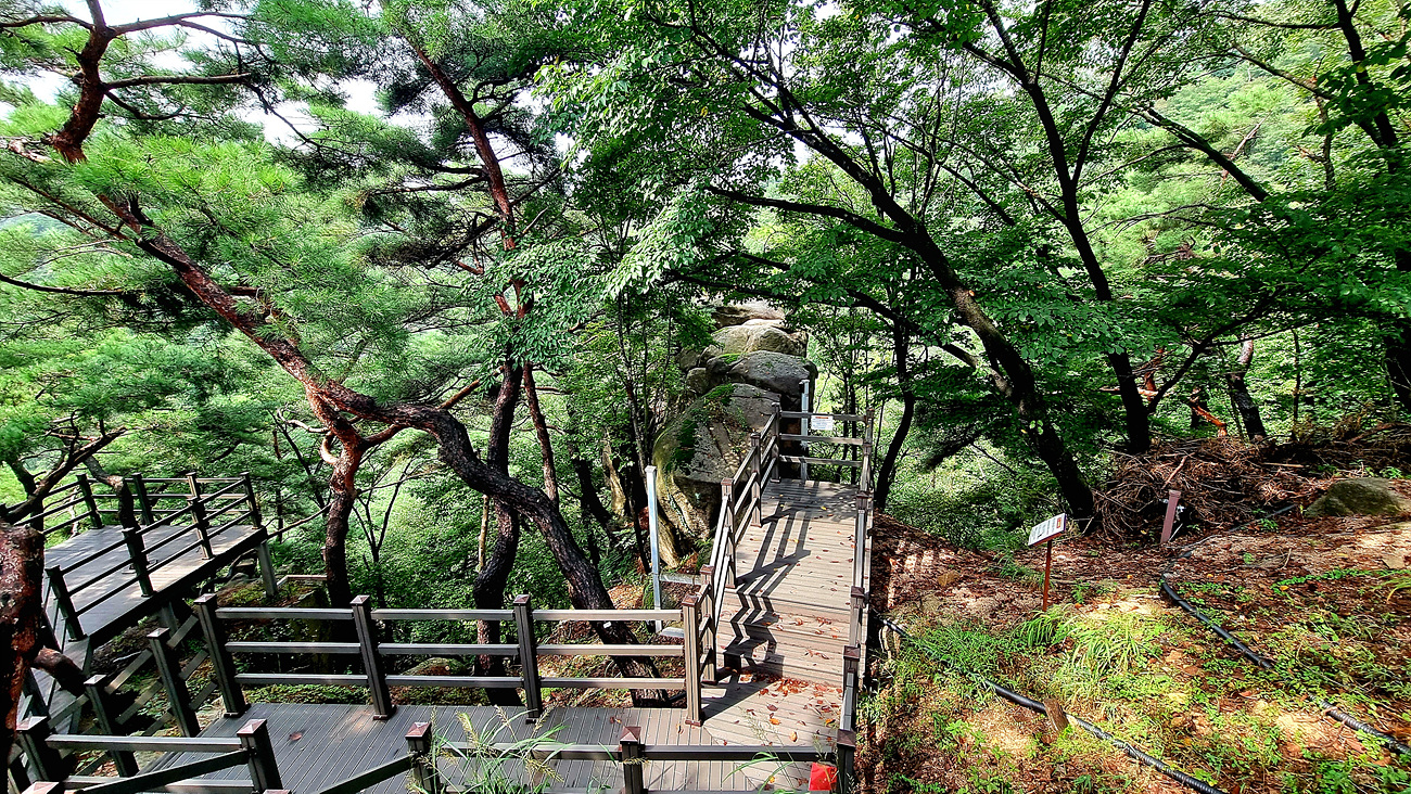 첫번째 계단으로 내려가면서 왼쪽으로 보면 조금 전에 쉬었던 촛대바위 쉼터가보인다, 숲에 가려저서 잘 보이지 않아 촛대 바위 형체를 못 보는게 이쉽다,