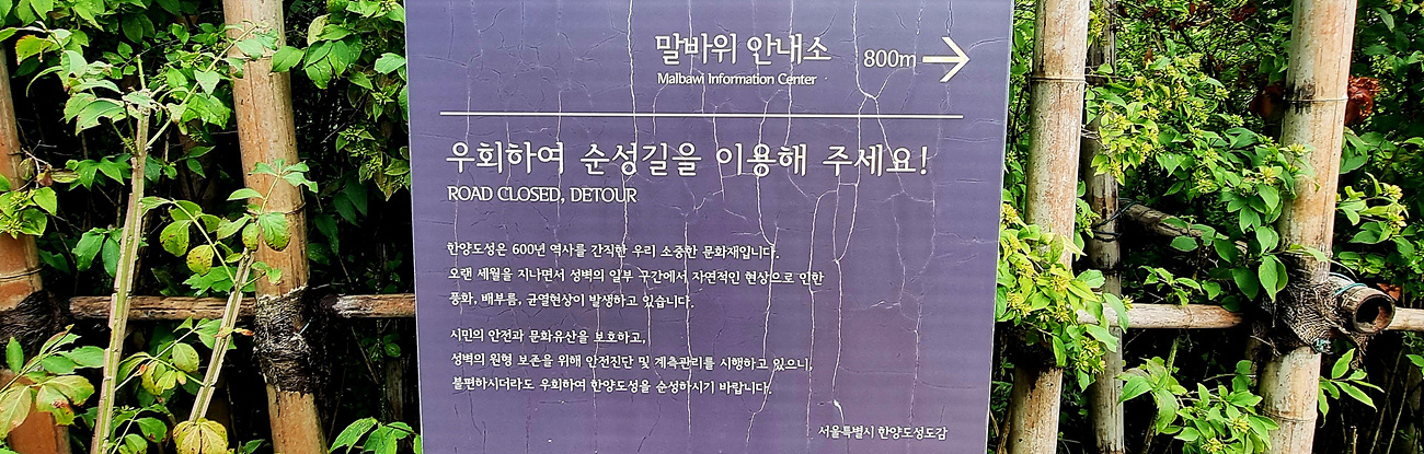 시민의 안전과 문화유산을 보호하고 성벽의 원형보존을 위해 안전진단 및 계측관리를 시행하고 있으니 불편하시더라도 우회하여 한양도성을 순성하시기 바랍니다, 라는 당부가 안내되어 있다,
