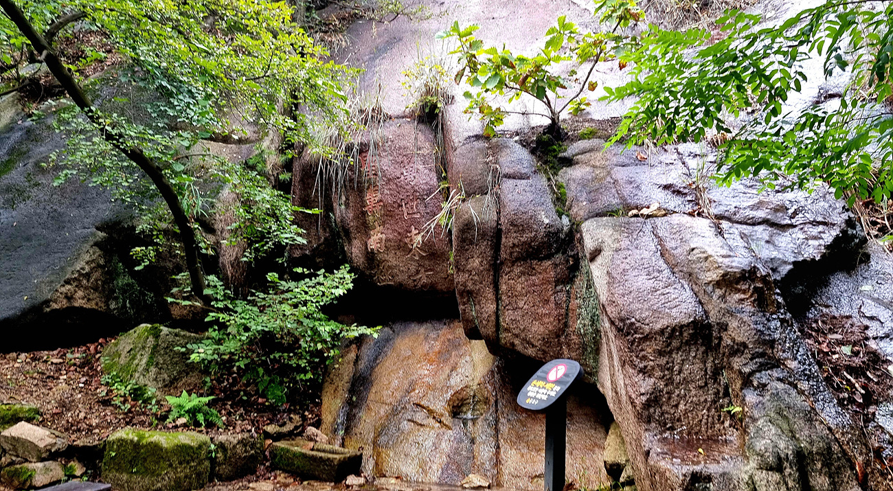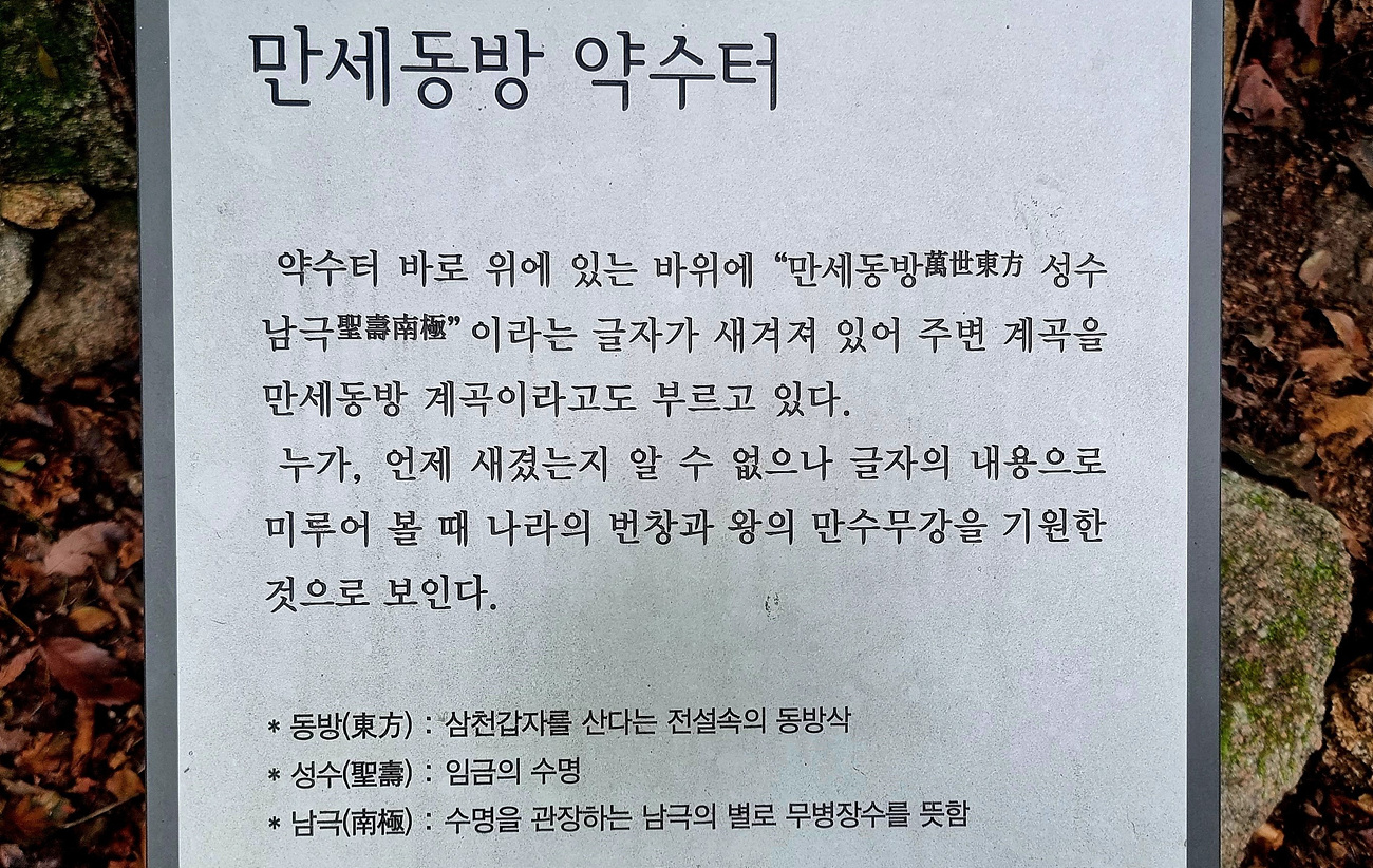 약수터 바위에는 "만세동방" "성수남극" 이라고 바위에 음각 글자가 새겨져 있다,