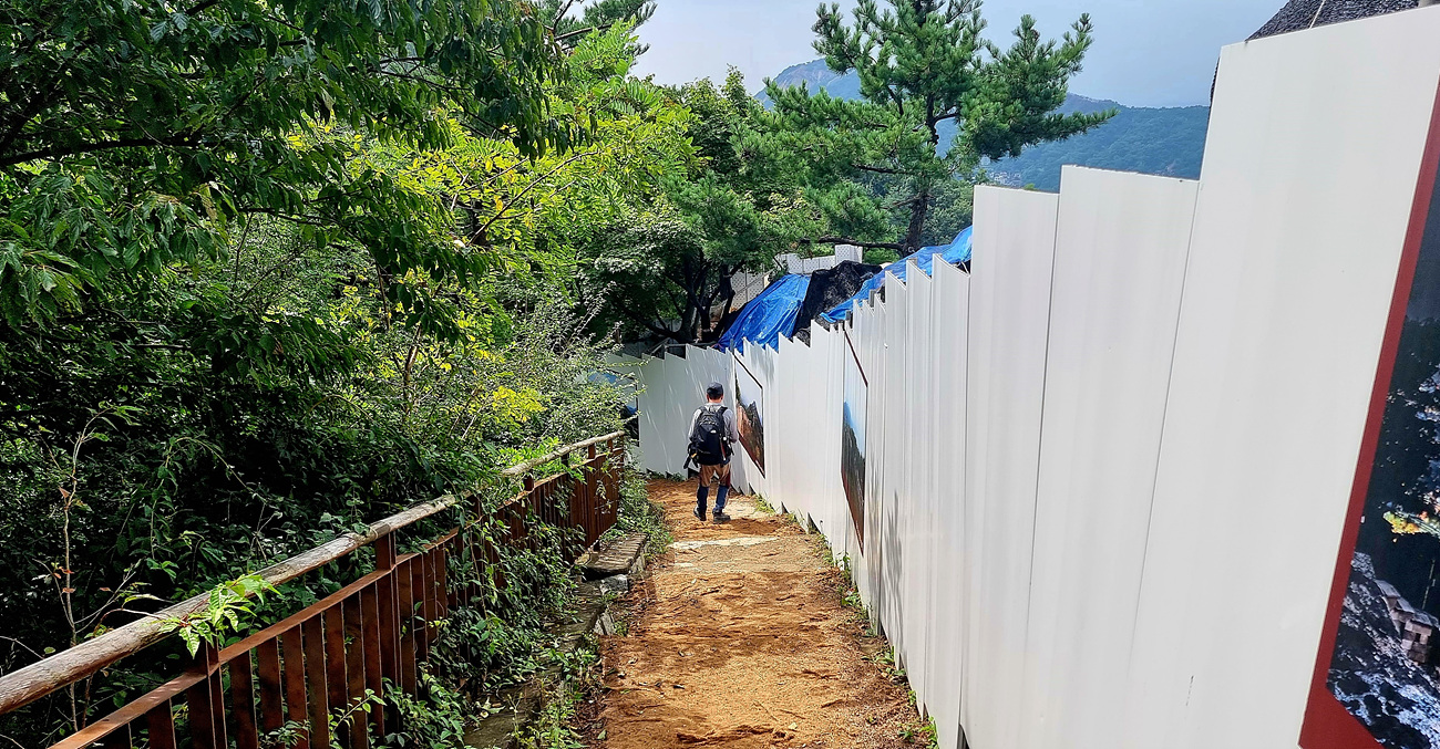 우회하라는 안내가 있는곳에서 아래로 내려와 첫번째 갈림길에서 왼쪽으로 가면 직진과 왼쪽 계단길이 나오는데 여기서는 왼쪽 계단길로 가야하고 그 다음에도 왼쪽 계단이 나오면 계단을 올라가야 한다,