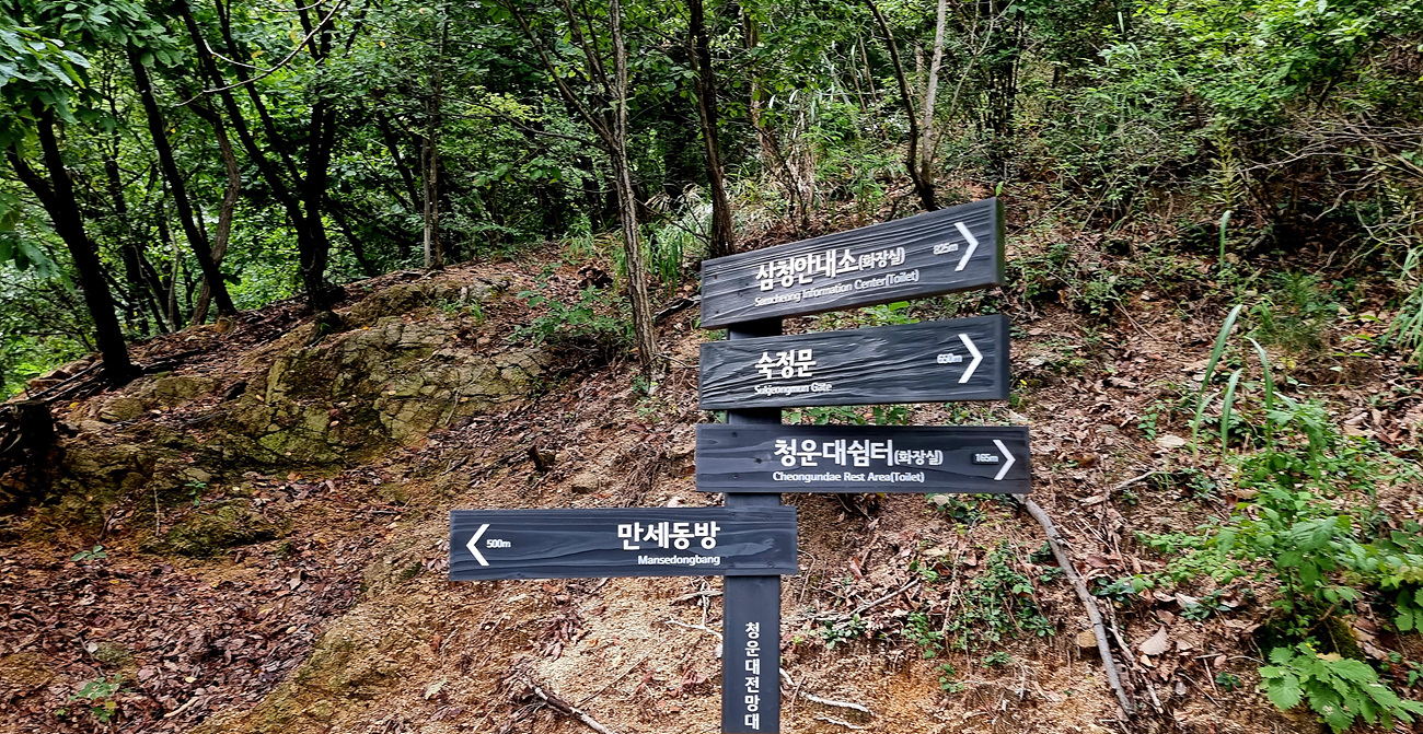 청운대에서 내려가면 청운대전망대가 있다, 조망터이자 갈림길인 이곳에서는 오른쪽은 청와대로 가는길이고 왼쪽은 삼청안내소로 가는 길이다,