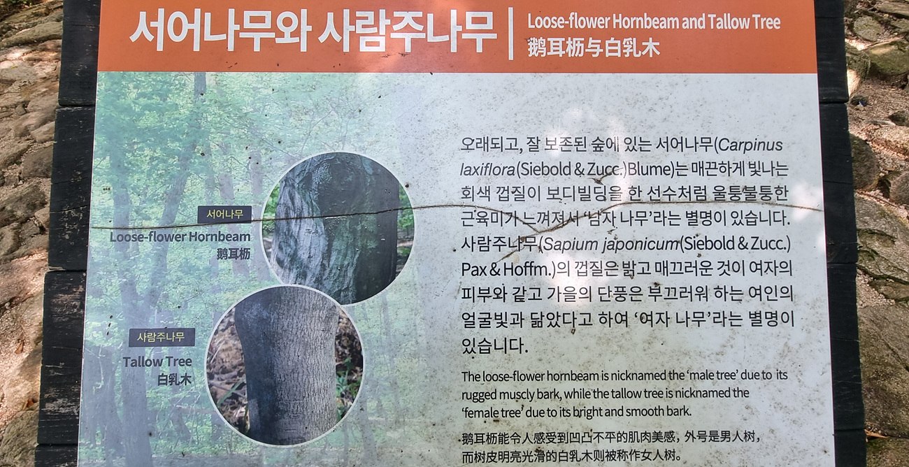 내원암에서 흔들바위로 올라가는길 서어나무와 사람주나무에 대한 안내가 있는데 오래되고 잘 보존된 숲에 있는 서어나무는 매끈하게 빛나는 회색 껍질이 보디 빌딩을 한 선수처름 울퉁 불퉁한 근육미가 느껴져서 남자 나무라는 별명이 있어며,