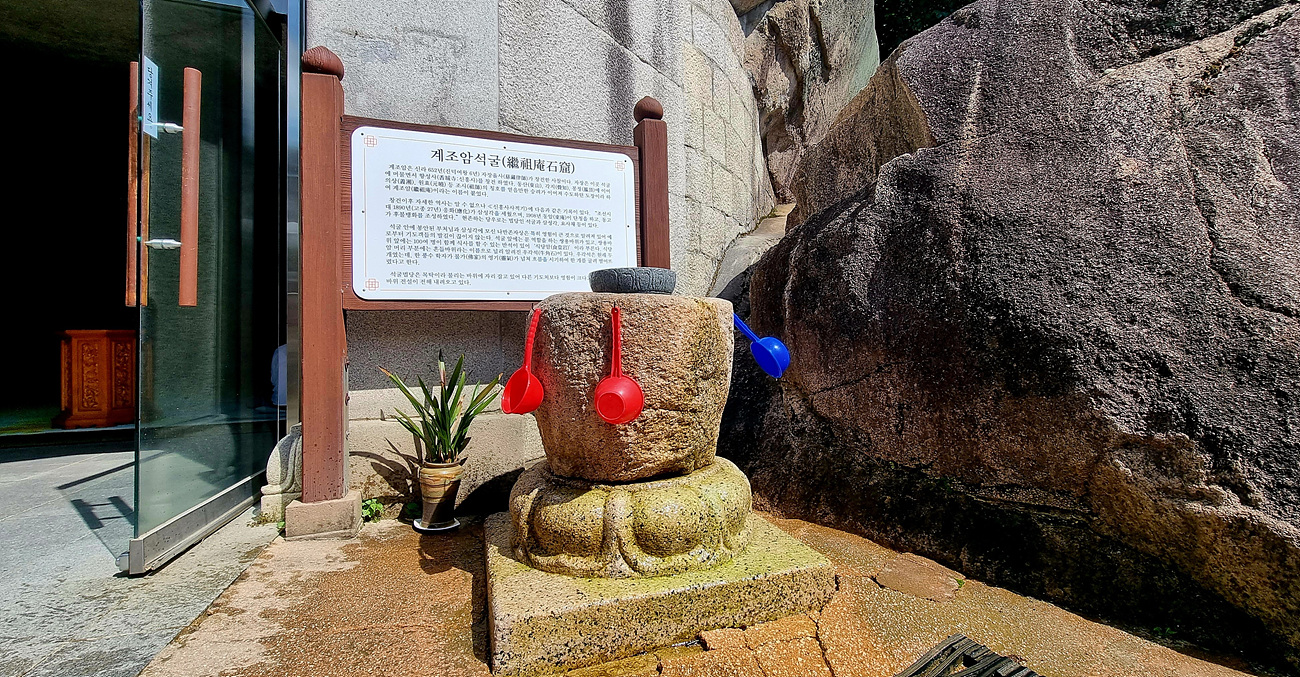 석굴 앞 약수가 흘러나오는 바위통 샘터에서 물 한모금으로 목을 축인다, 절 을 갈때마다 느끼는 공통점 하나는 도저히 물이 없을것 같은 곳 바위 틈에서 샘이 터저 나오는 것을 보면 것을 보면 신비롭기 까지하다, 하기는 물이 있었기에 그곳에 절을 짓기는 했겠지만, 바위틈에서 물이 나오는 절에서는 거의 같은 전설이 전해진다, 원효대사나 의상대사, 기타 유명한 고승들은 물이없는 곳에 암자를 지을때 지팡이를 바위에 꽃아서 물이 솟아나게 했다는, 여기도 원효대사와 의상대사가 있었던 곳이니 그런 전설로 뮬이 나오는 곳일까,