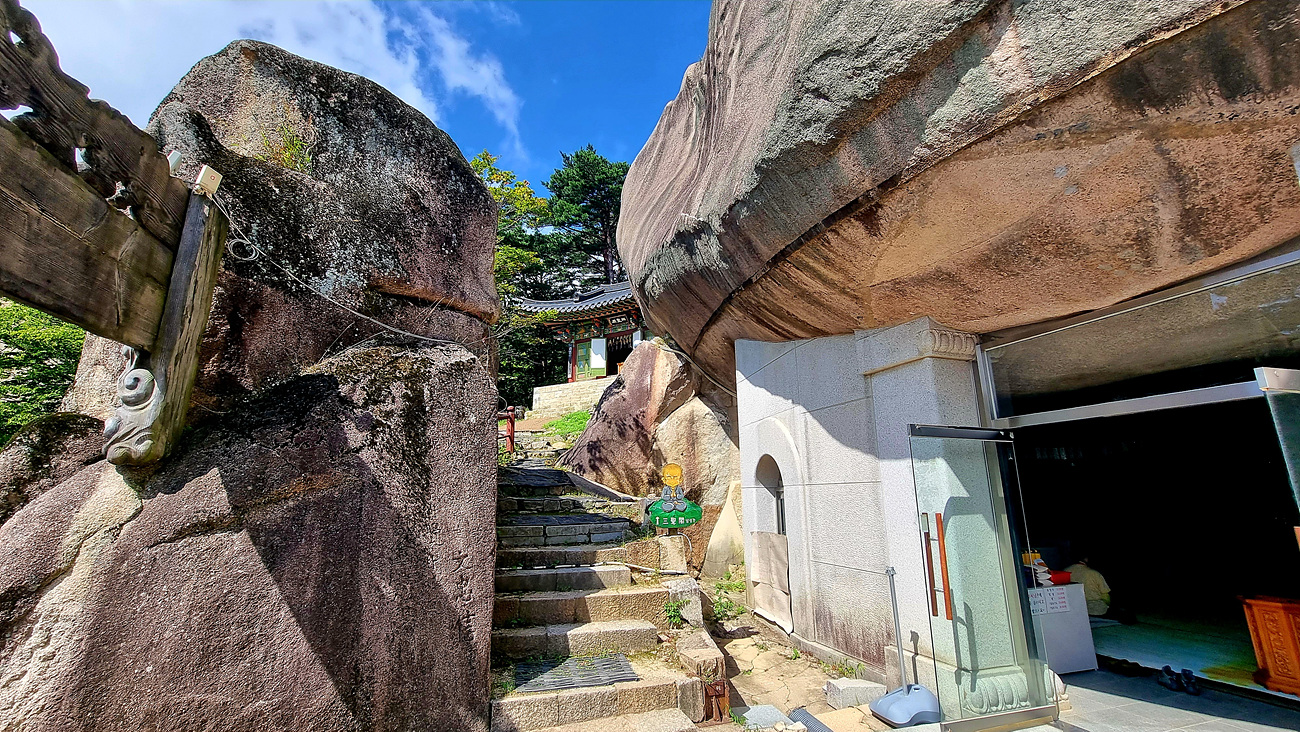 현존하는 당우로는 법당인 석굴과 삼성각 요사채등이 있다, 바위틈으 위에 보이는 당우가 삼성각이다