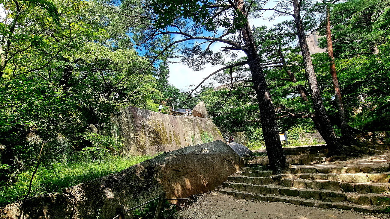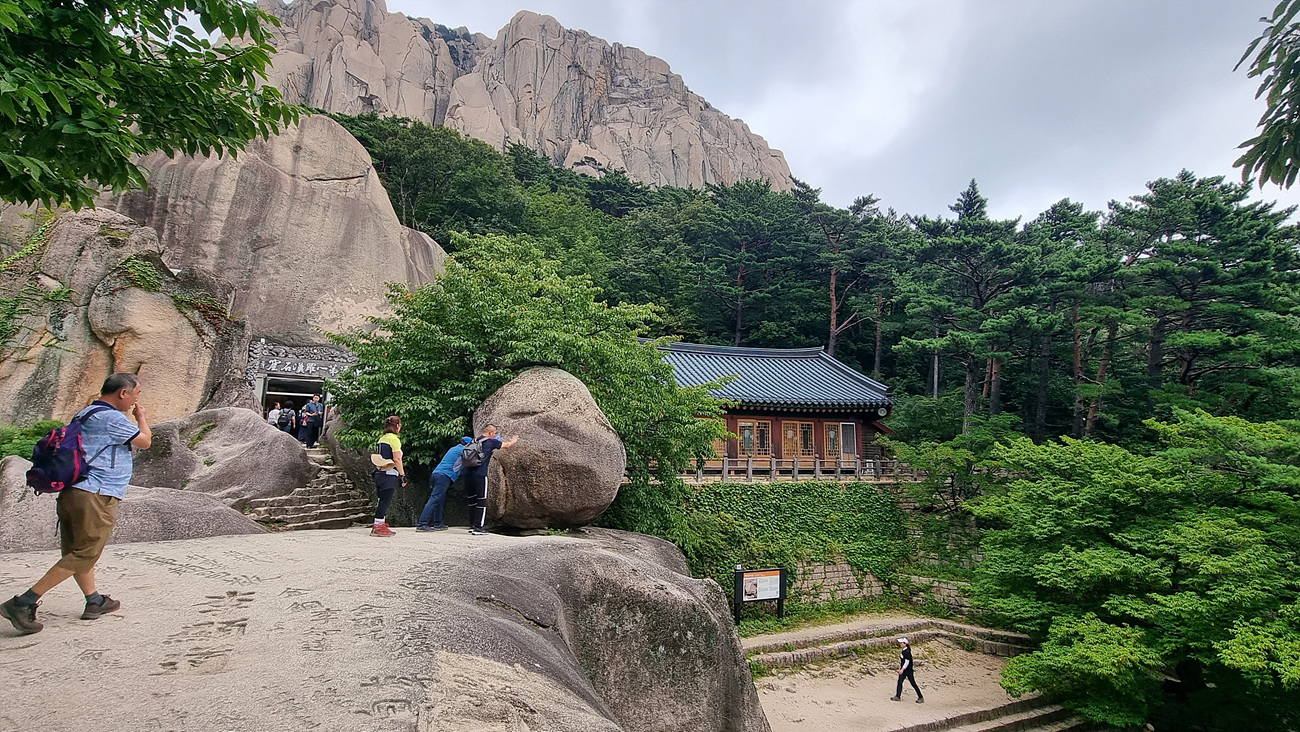 계조암석굴과 요사채 그리고 그 뒤로 뻩어내린 울산 바위 자락이 그림처름 다가 온다, 잘 그려진 동양화는 이런 그림이 아닐까? 몇 사람이 여기까지 왔어니 흔들바위를 흔들어 보려고 힘껏 밀어보는것도 보인다, 흔들바위라고해서 조금만 밀어도 흔들릴거라 착각하는 사람들이 많은데 실상은 성인 남성 2~3명이 온 힘을 다해 밀어도 살짝 딸깍이는 정도다.