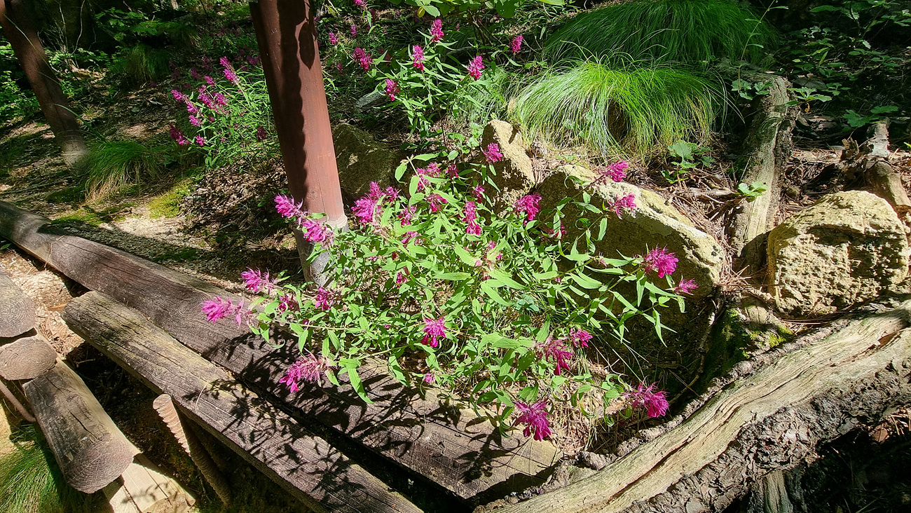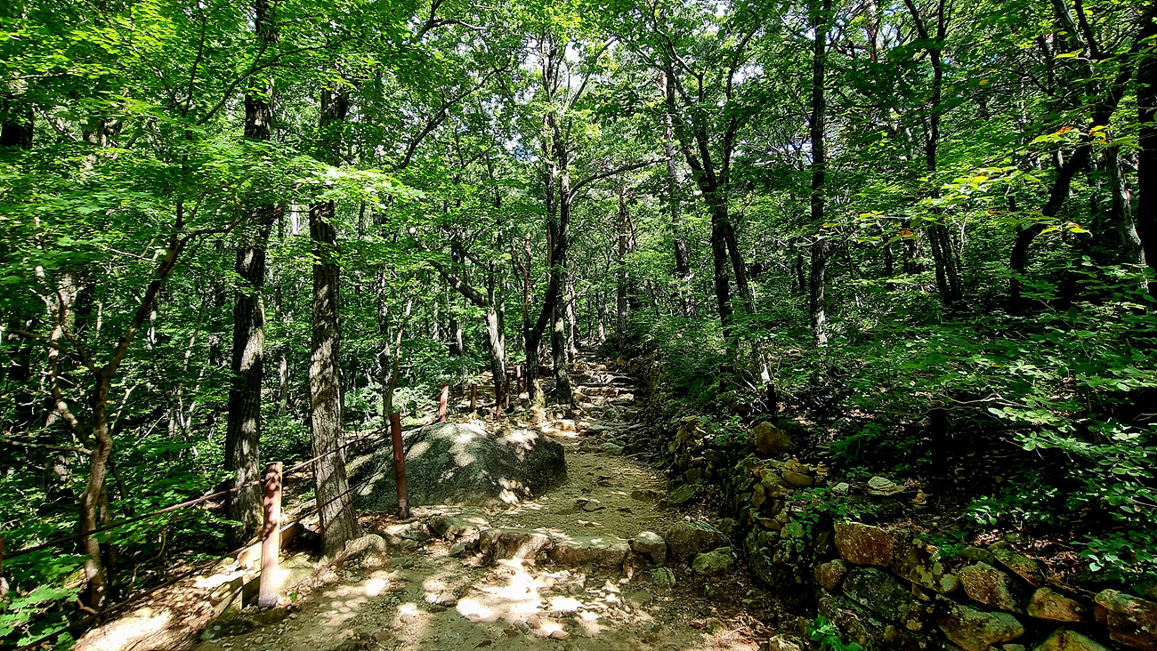 금강송 대문을 지나 큰 꿩의 비 꽃이 많이 보이는 곳으로도 지나간다,