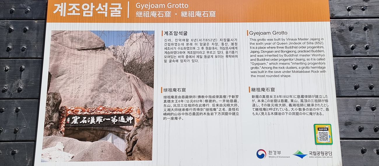 계조암석굴 안내판에는 신라, 진덕여왕 6년(서기 652년) 자장율사가 건립했다, 본래 이 암굴은 자장, 동산, 봉정, 세조사가 수도 하였어며 그 후 원효대사가 의상대사에게 계승하였다고 하여 계조암이라고 블렀다고 적혀 있다,