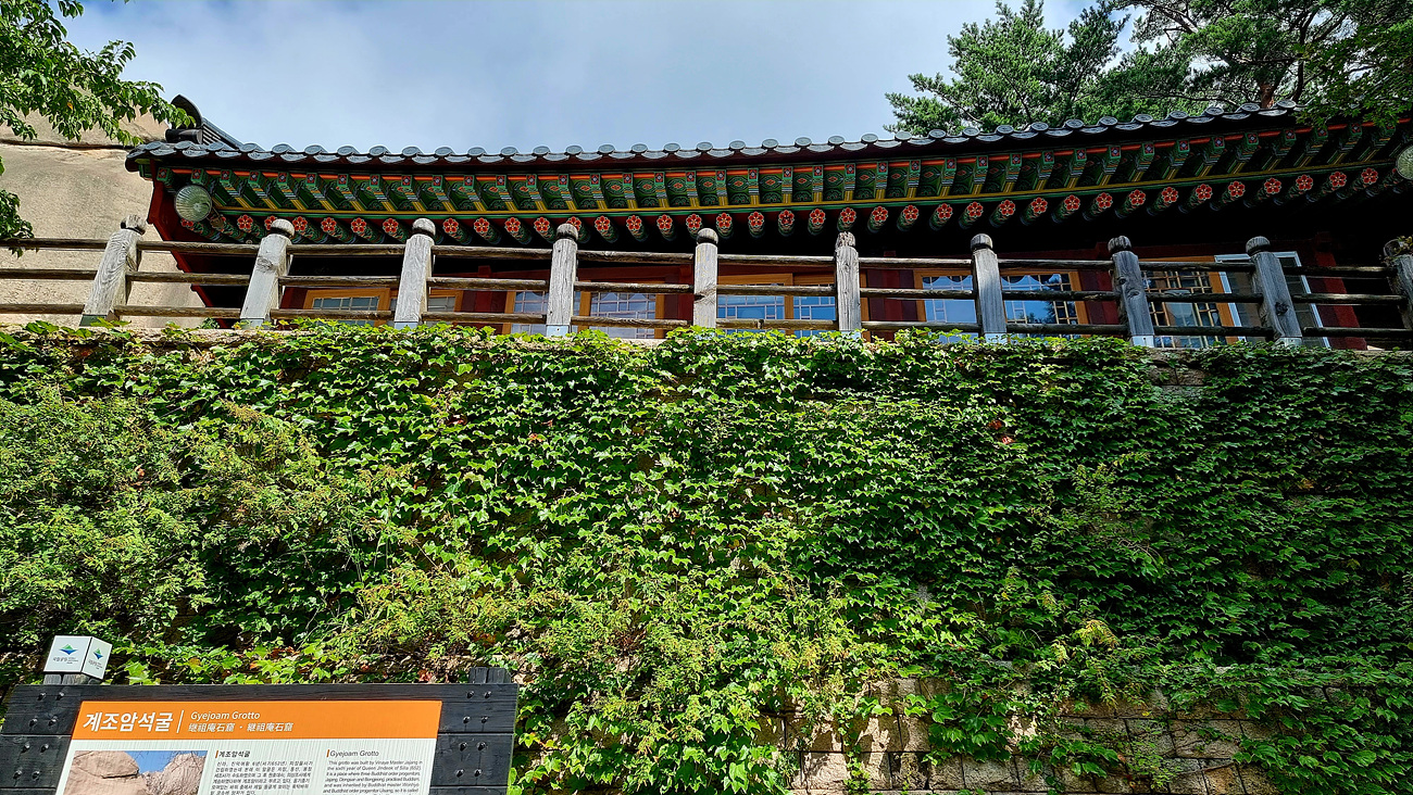 계조암석굴 안내판 위에 있는 저 당우(건물)는 계조암석굴 요사다,