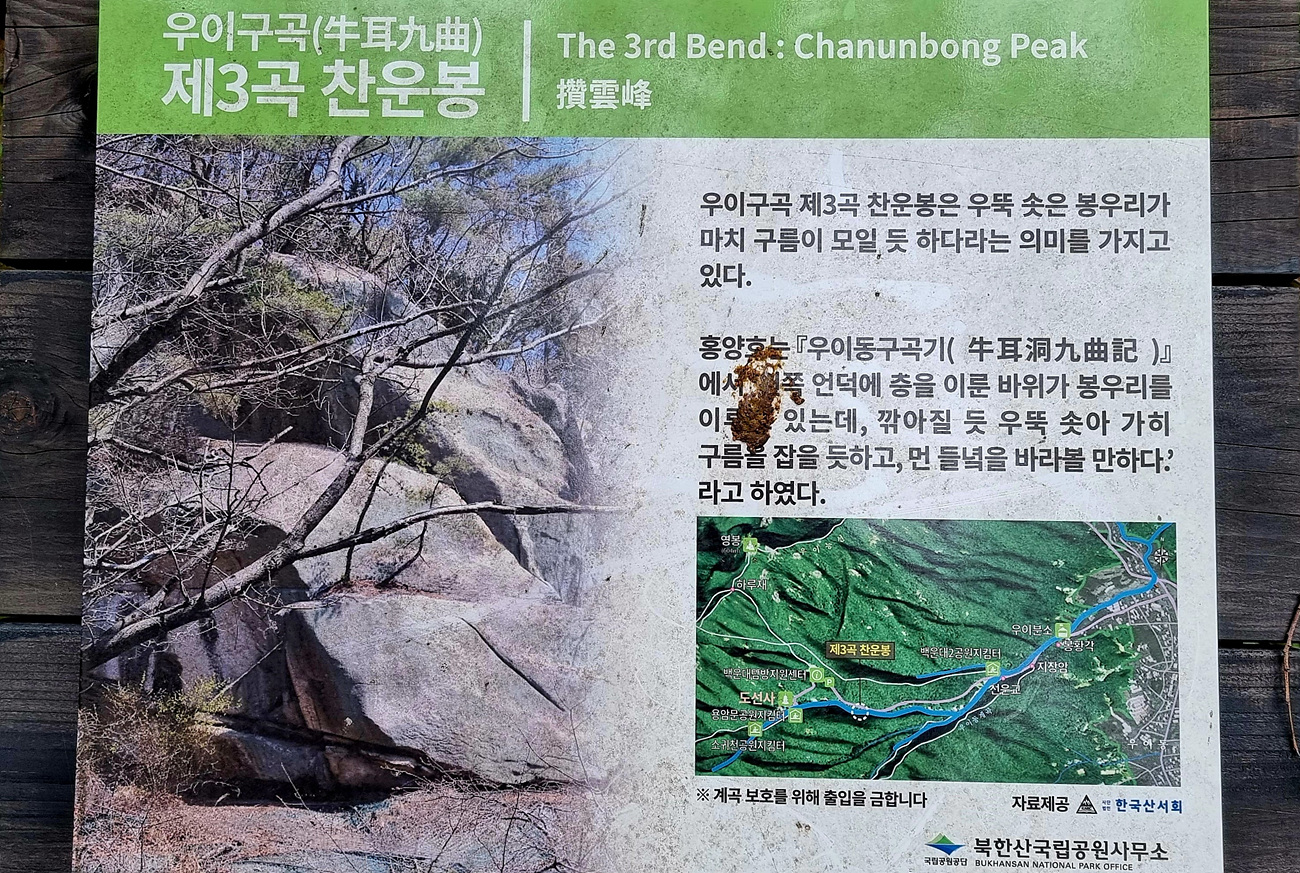 그리고 그다음에는 우이구곡 제3곡 찬운봉이다, 찬운봉은 우뚝솟은 봉우리가 마치 구름이 모일듯 하다, 라는 의미를 가지고 있다 고 안내되어 있다,