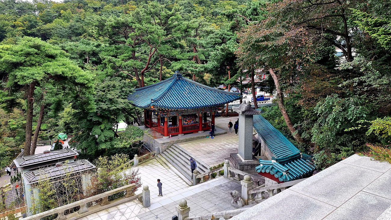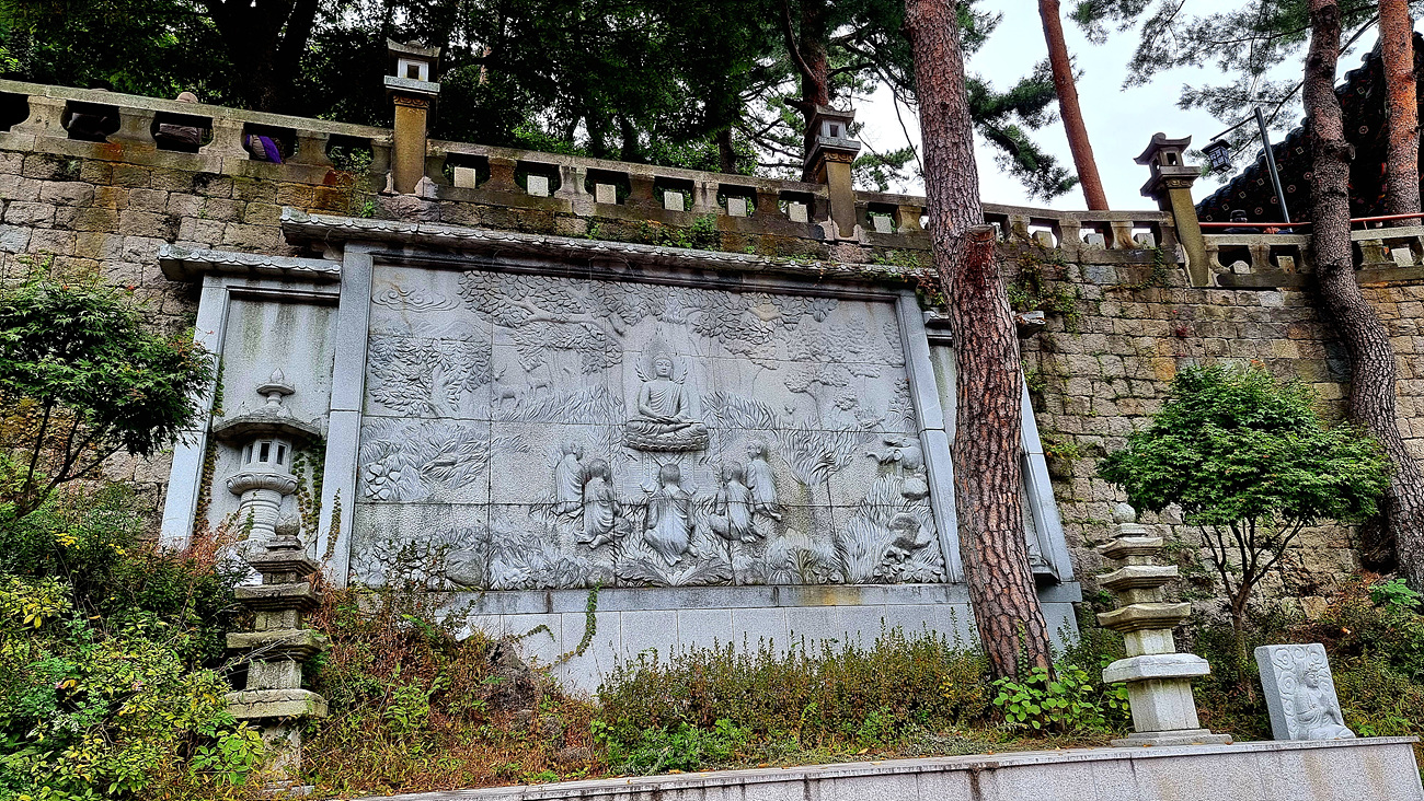범종각을 지나 12띠별 안내 벽면을 따라 대웅전으로 들어간다, 끝에 보이는 당우는 정묵당으로 편의시설이다,