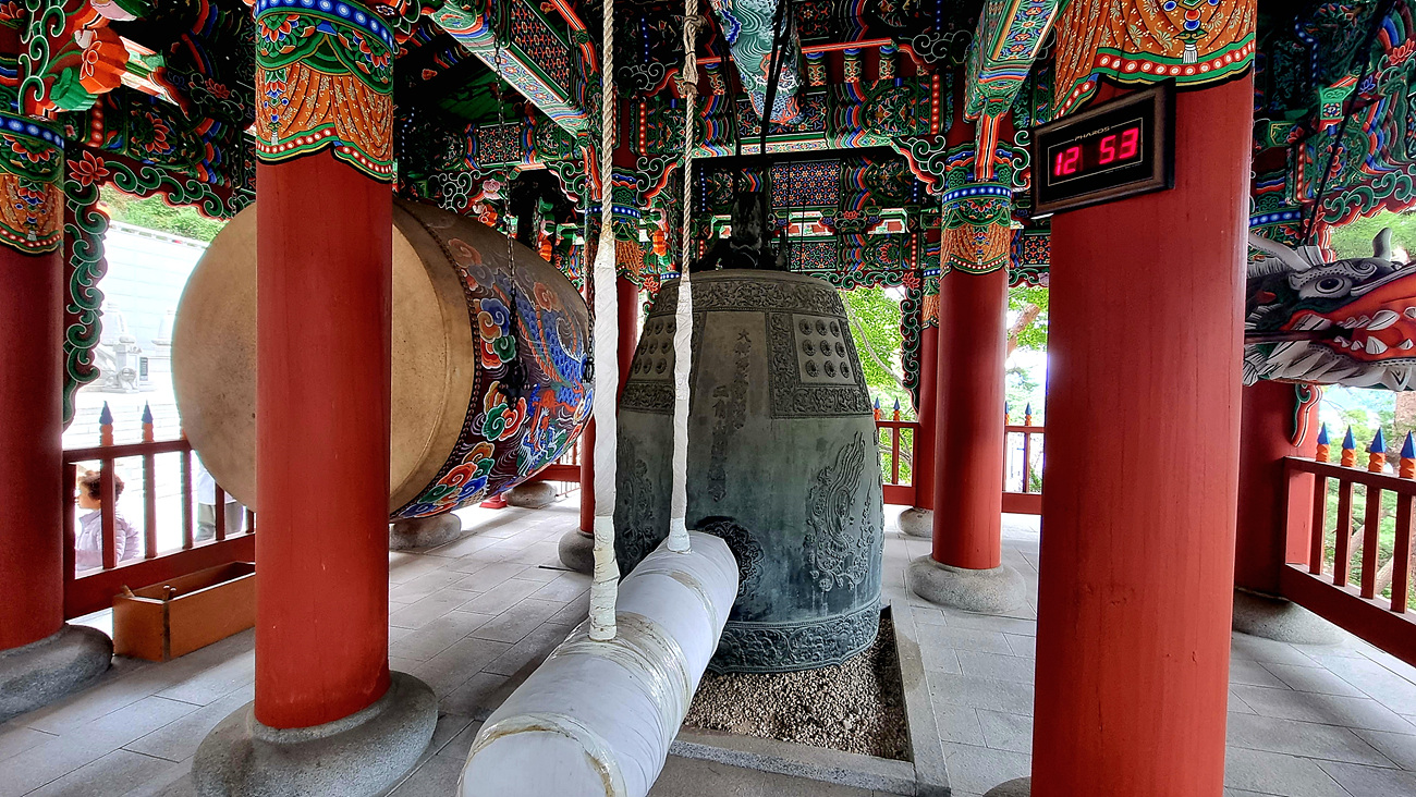 종각으로 내려왔다, 큰 북도 보이고 범종이 걸려있는 종각이다, 절에 가면 절의 상징처름 범종각이 있는데 2층 樓閣(누각)으로 되어 있을 때는 범종루라 하고, 불전 사물 가운데 범종만을 봉안하는 경우에는 범종각이라고 한다.
