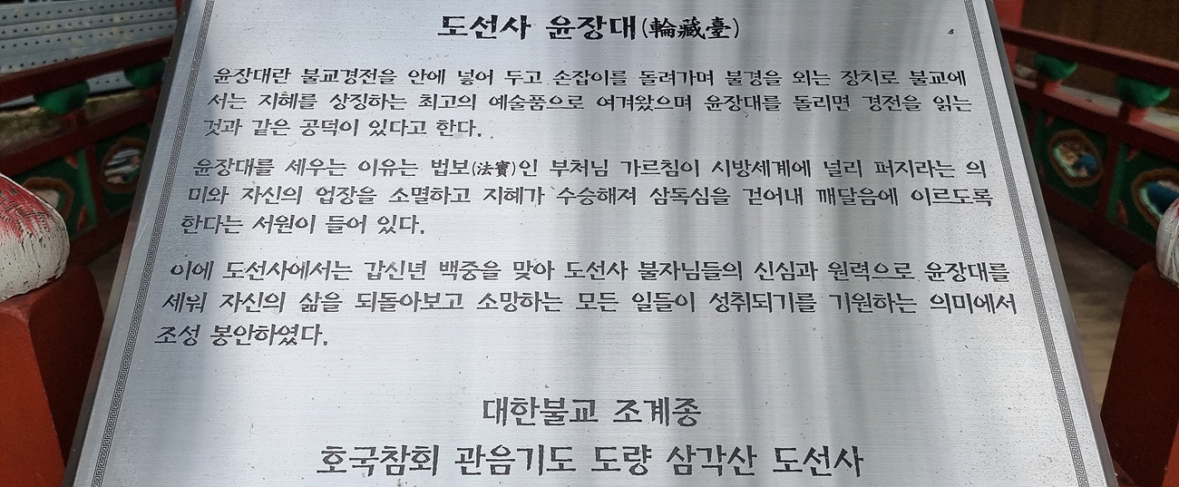 윤장대를 세우는 이유는 법보인 부처님 가르침이 시방세계에 널리 퍼지라는 의미와 자신의 업장을 소멸하고 지혜가 수승해져 삼독심을 걷어내 깨달음에 이르도록 한다는 서원이 들어있다,
