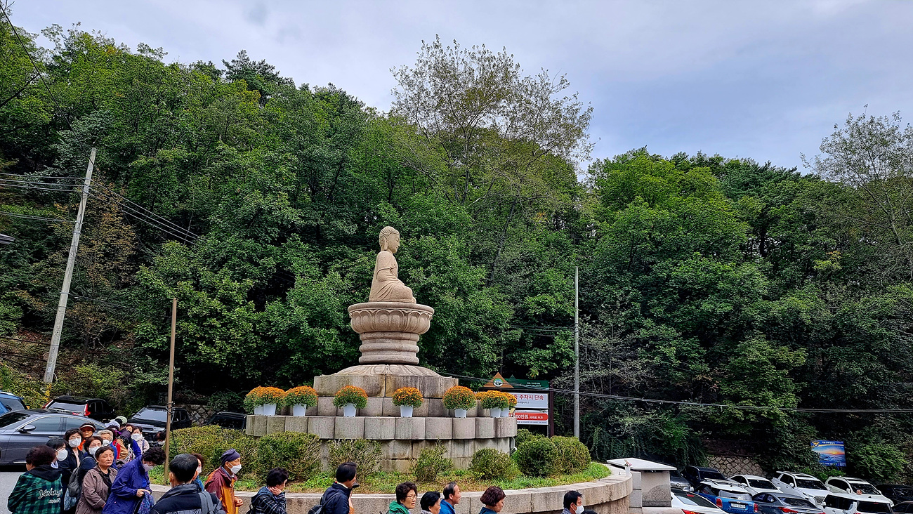 도선사 입구 주차장 우이역에서 도선사 까지 운행하는 셔틀버스를 타기 위해 도선사신도들이 줄을 서 있다, 도선사 셔틀버스라서 공식적인 버스요금은 없지만 내릴때 불전함에 시주를 하면 되는 구조로 운영하는 버스다, 주차장에는 도선사 불교대학이라는 건물이 자리하고 있다,