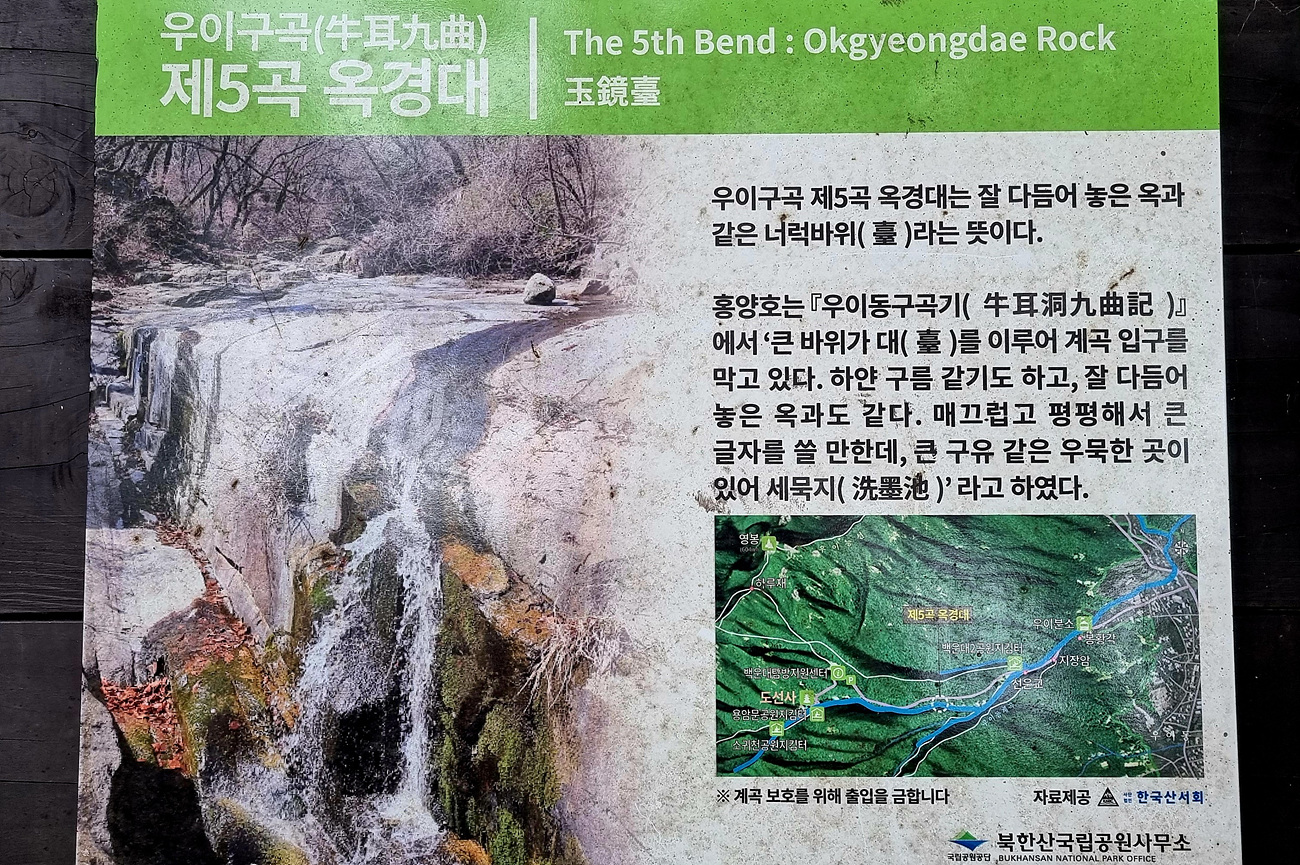 우이구곡 제5곡 옥경대가 있다는 안내다, 옥경대는 잘 다듬어 놓은 옥과같은 너럭바위 라는 뜻이라고 했다,