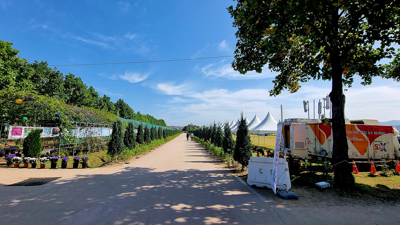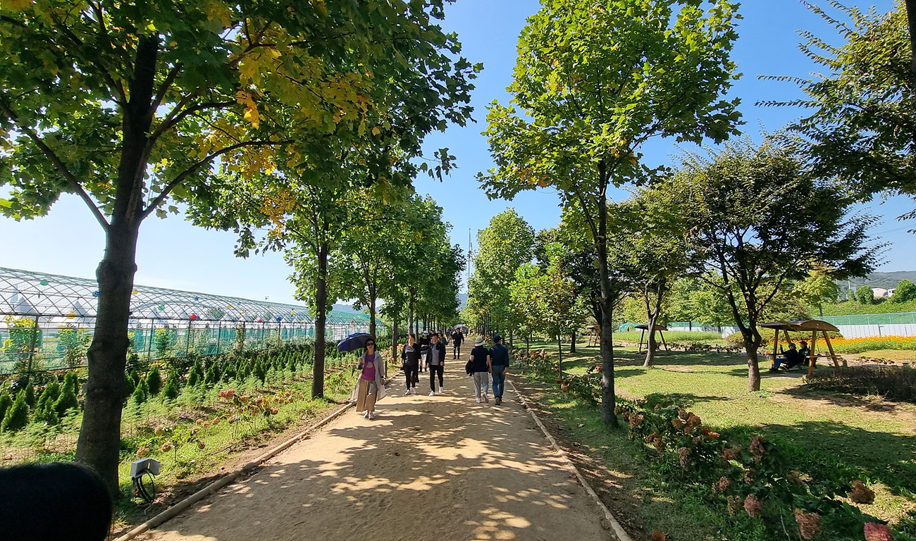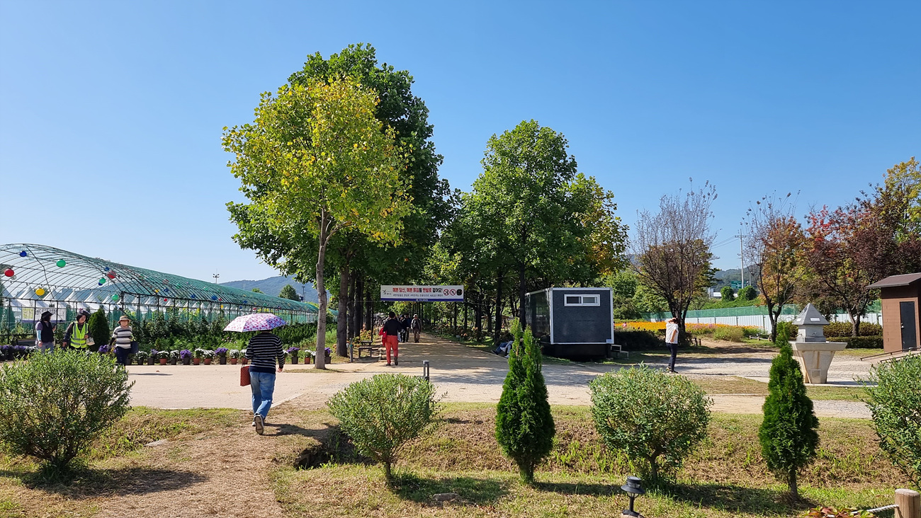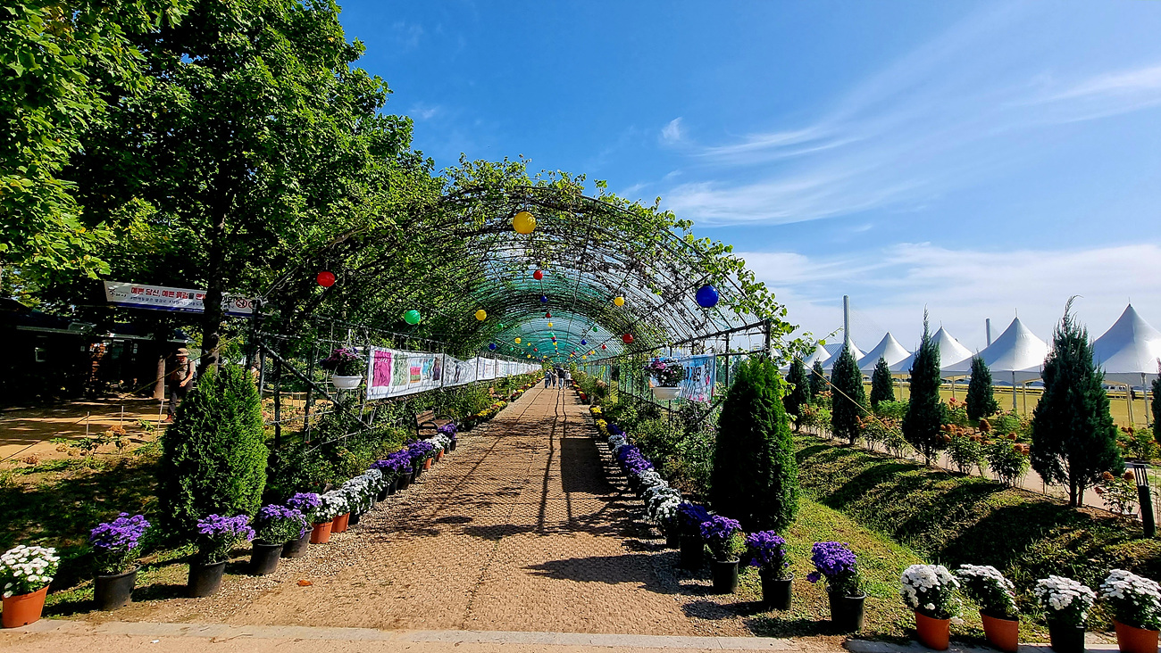 터널 양쪽으로 국화 화분도 줄을 지어 있고 꽃들도 피여 있어며