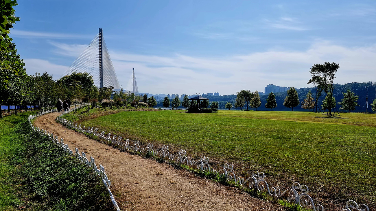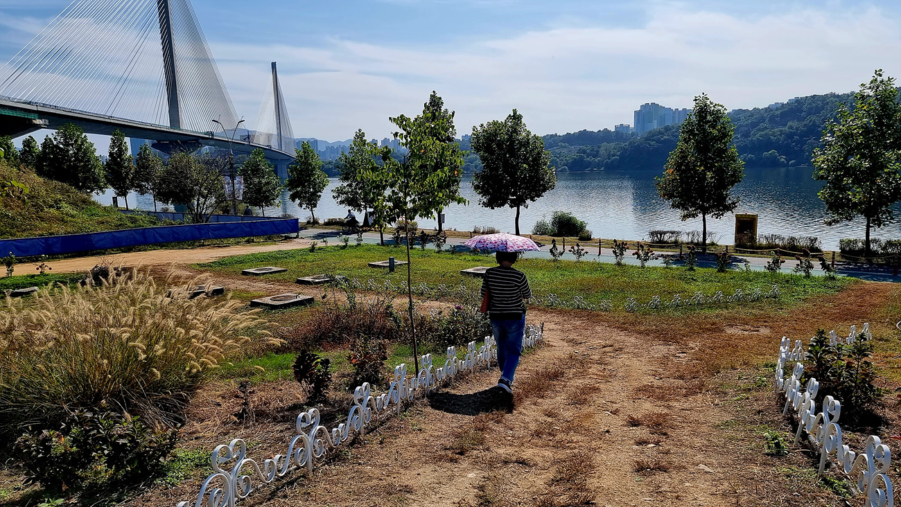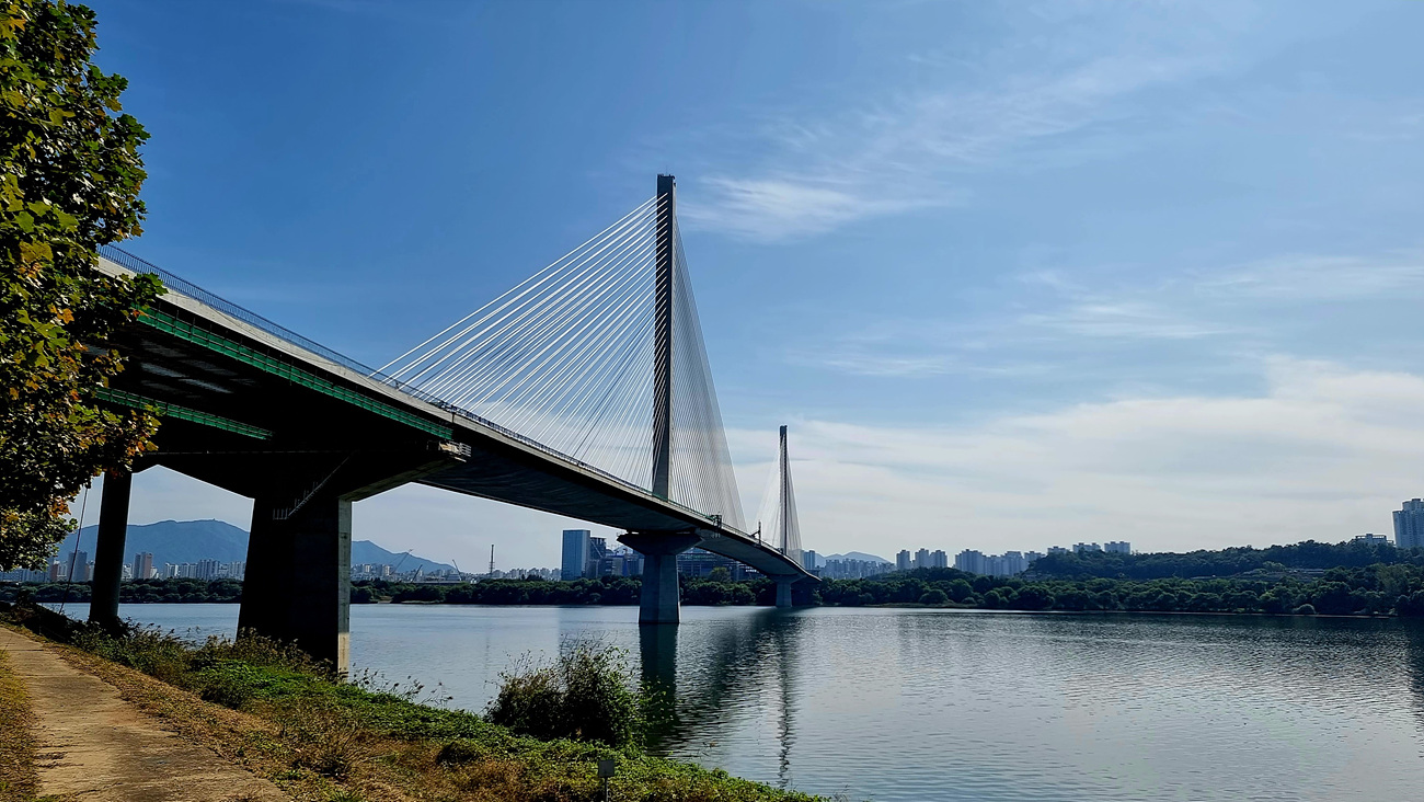 한강에 세워지고 있는 다리가 보이는 한강변으로 나가면
