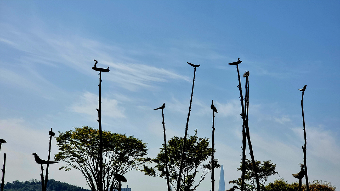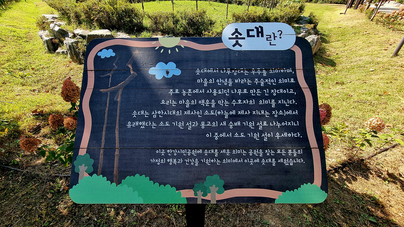 이곳 한강시민공원에 솟대를 세운 의미는 공원을 찾는 모든분들의 가정의 행복과 건강을 기원하는 의미에서 이곳에 솟대를 세웠다, 라는 안내가 있다,