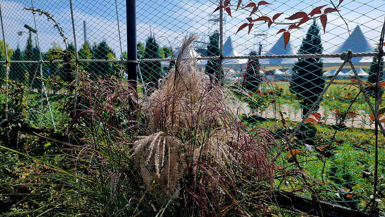 솟대를 지나 코스모스 단지로 가는길 앞쪽으로 하늘 높이 세운 두개의 기둥에 줄을 걸어 놓은게 보인다,