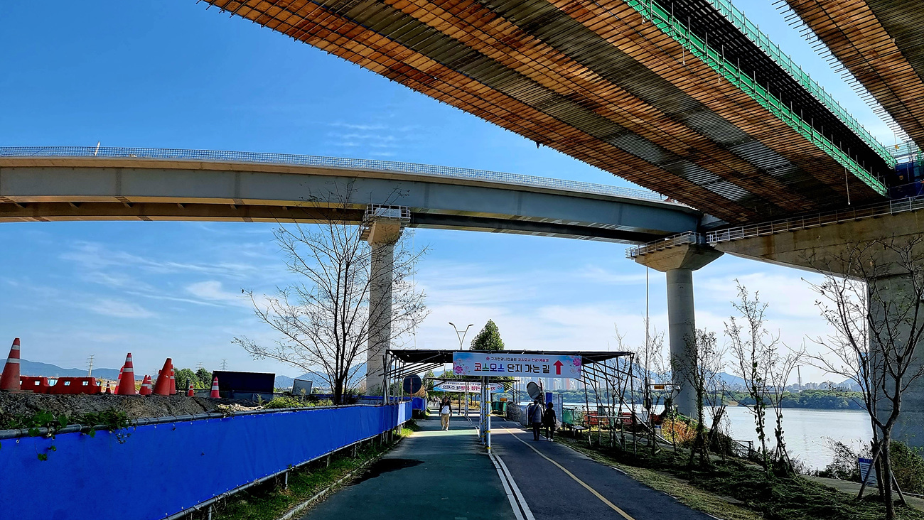 건설중인 고속도로 위쪽부터 구리시민한강공원 코스모스 단지가 시작이 된다,